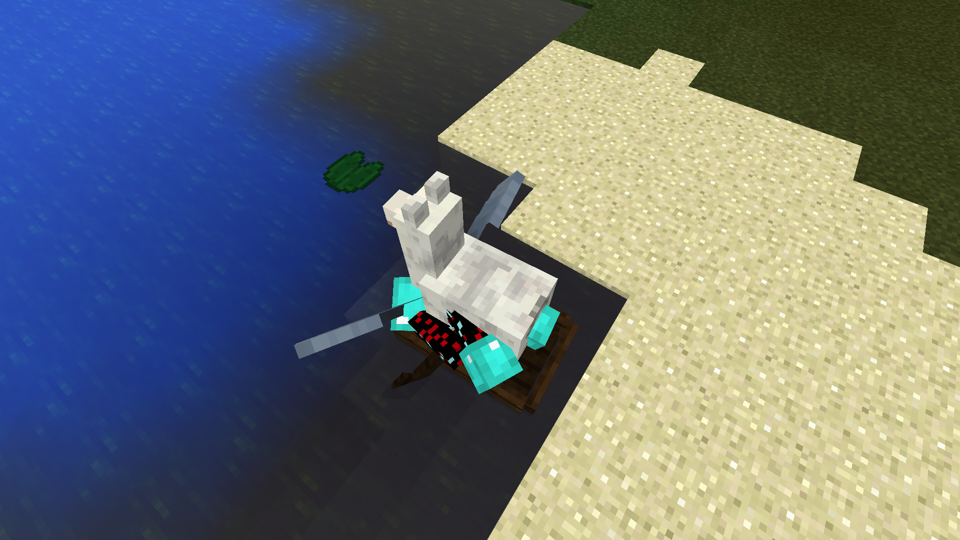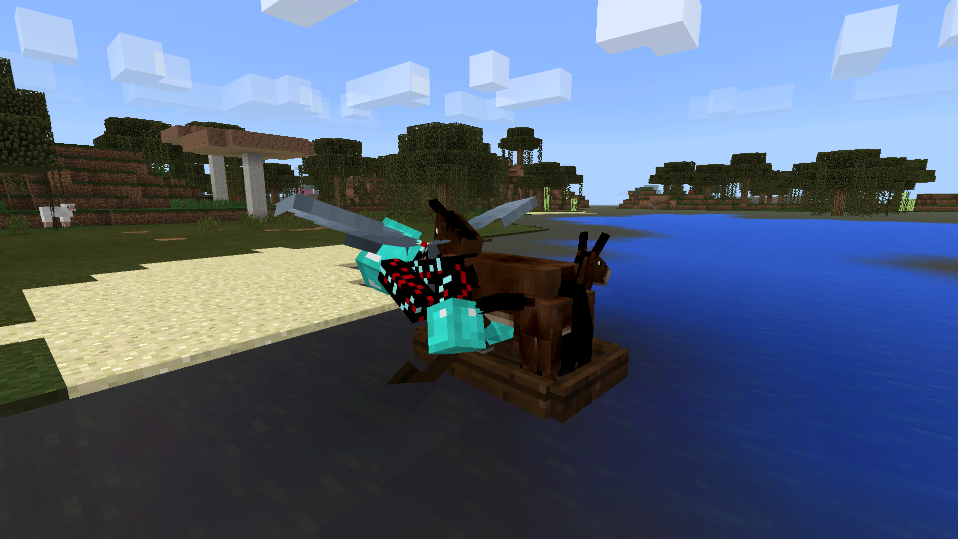 If you mount a vehicle or animal when flying with Elytra, the players model remains in the flight position, instead of cancelling the elytra flight.