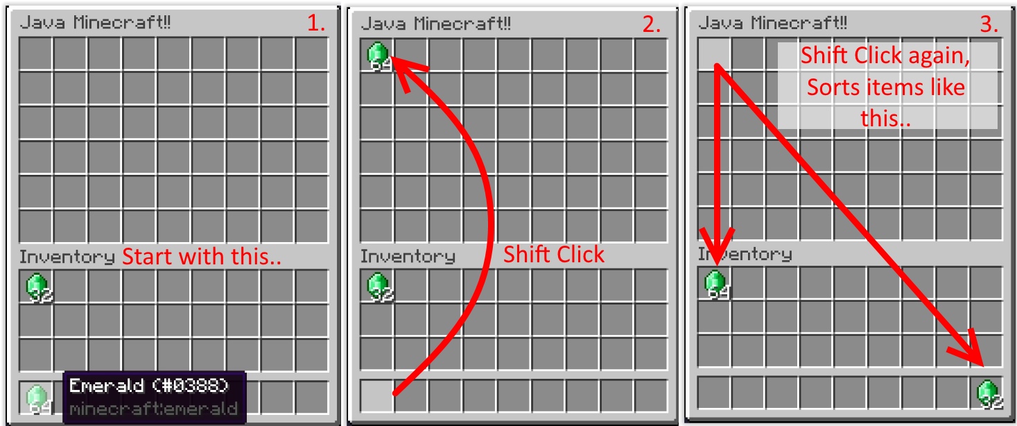 i shift click my 64 in the hotbar. it first stacks up the 50 to 64 in the inventory and moves the rest (50) in the chest.