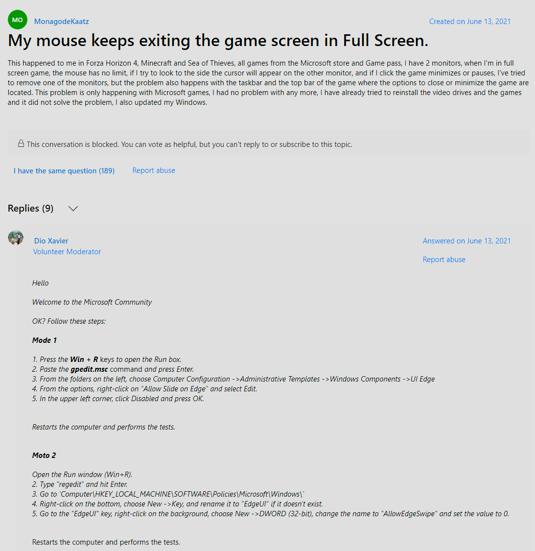 When using mouse and keyboard, the cursor doesn’t lock to the screen, I’ve checked several options to fix this and it’s the only game that has this issue. I see everywhere online of many people reporting this bug and still no fix. Taskbar pulls up if you move down too much, mouse goes to the second monitor if you move too much to the side. The Minecraft boarder pops up in “full screen” if you move it up too much. Very infuriating and no fix gives a permanent solution. I’ve checked solutions within the game, within windows settings and everything should be working but it’s not. The cursor will never lock on the screen and I see hundreds of reports all over Microsoft community and Reddit Minecraft communities with no permanent solutions.