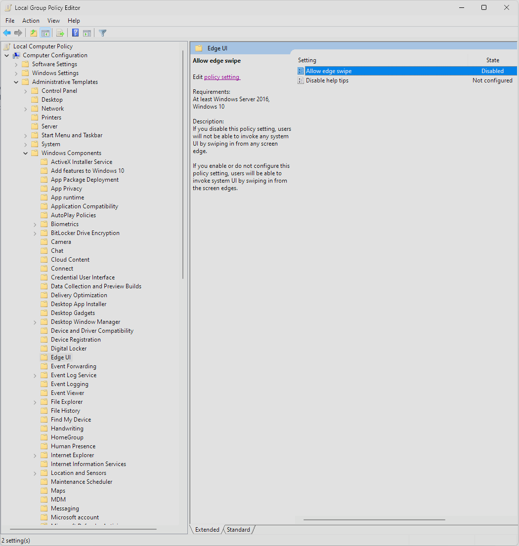 Navigate to "Local Computer Policy>Computer Configuration>Administrative Templates>Windows Components>Edge UI>Allow edge swipe"
