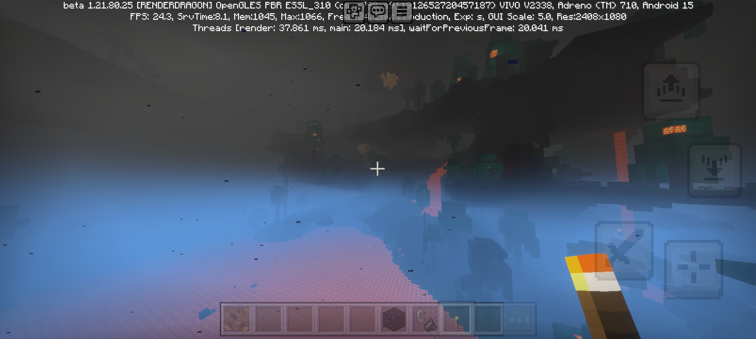 I am playing the beta when I have activated the vibrant visual graphics everything is going good in overworld but in the nether many areas are too dark that I can't see a single thing even the blocks where I am standing and there is tooo much fog we can't explore nether and as soon as entering the portal every item in inventory started shaking and a huge lag as soon as I entered in nether I have 8gb ram phone with snapdragon processor how it lags so much and also in the overworld water there was bug that if we goo too High we see the shadow of kelps through water it looks weird please fix mojang I know when update comes it makes everyone happy like it always does.