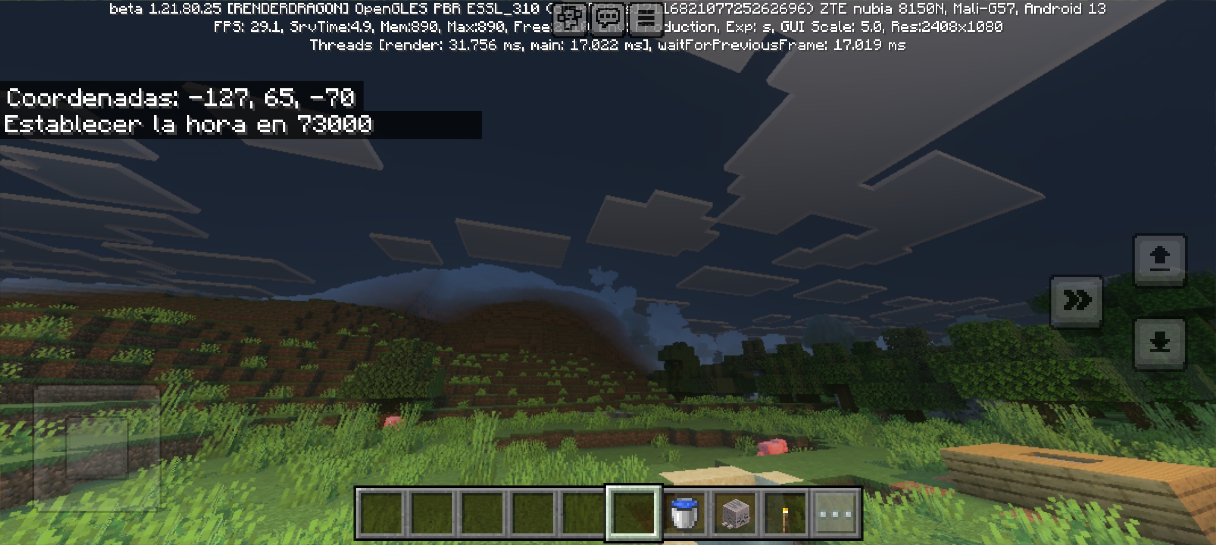 During day with vibrant visuals I can see the blocks with reflection, the brightness on animals, but the sky is grey like it’s night but I can still see the sun.