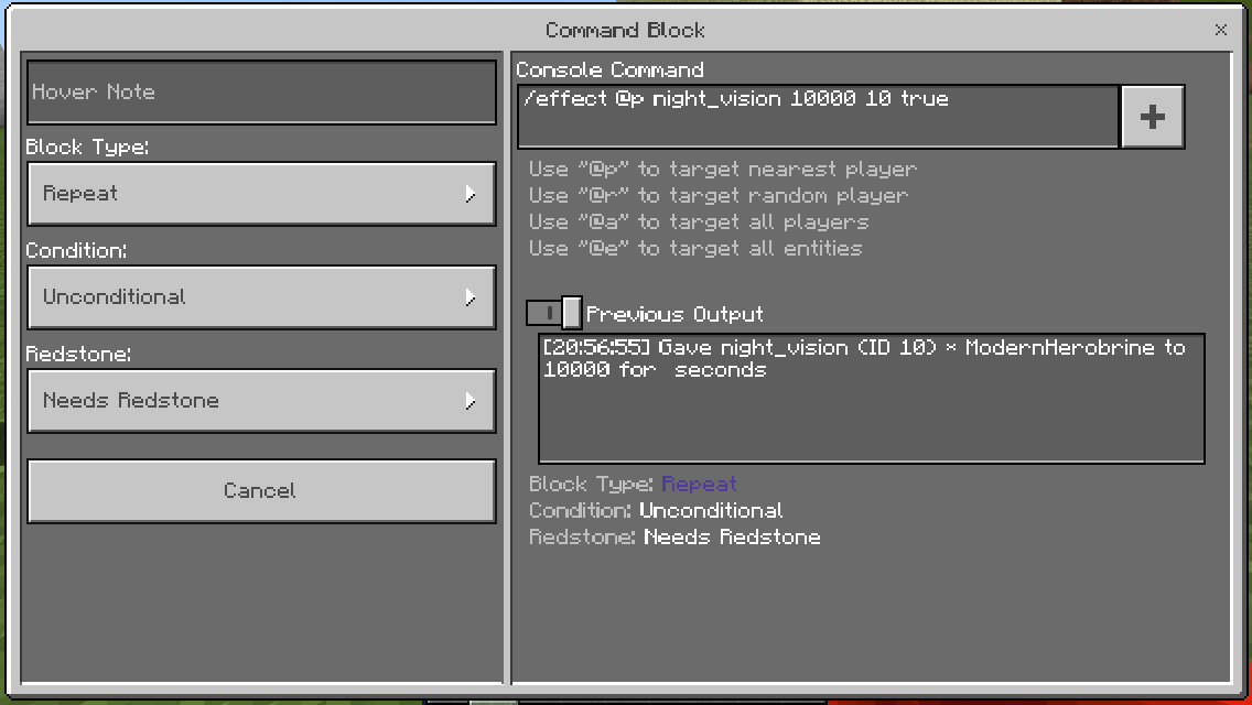 When using the command /effect, it seems to give out wrong information and not fully work. I tried and found it by doing "/effect @p night_vision 10000 10 true" but the no particles being at true didn't work and it gave odd messages and when I removed true, it worked fine, and I removed amplifier as well so it'd be default, and it gave an even more broken result, which it should give an error then.
