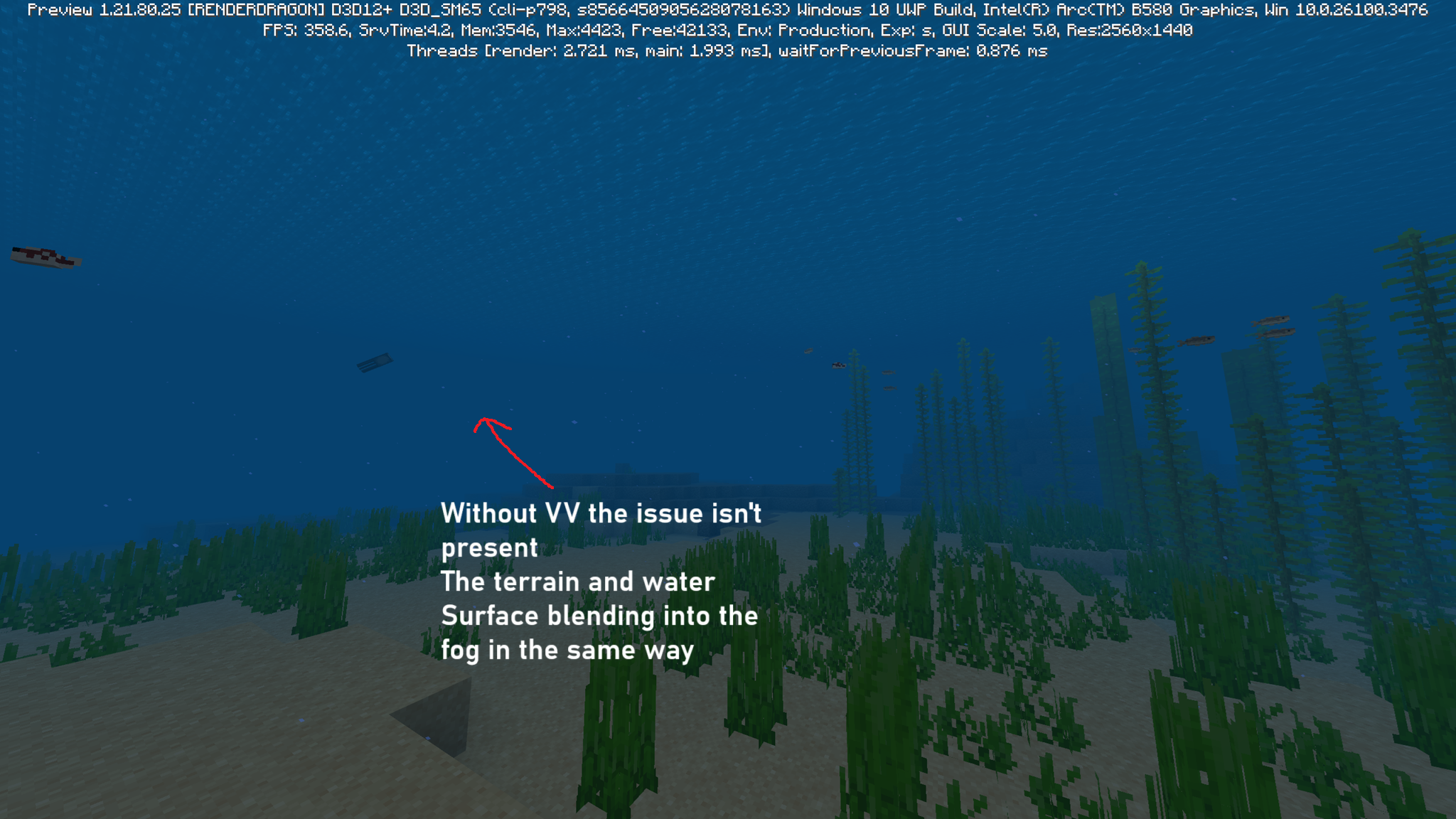 - Compare the way the water surface is visible with Vibrant Visuals enabled vs disabled