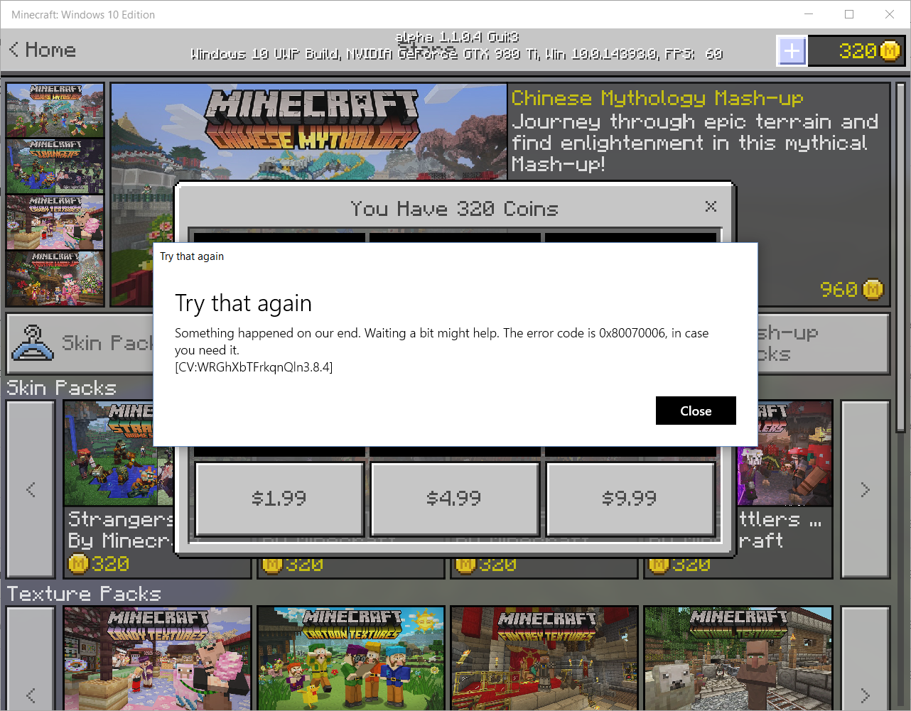 I'm trying to make a purchase of Coins from the Marketplace but I keep getting an error: