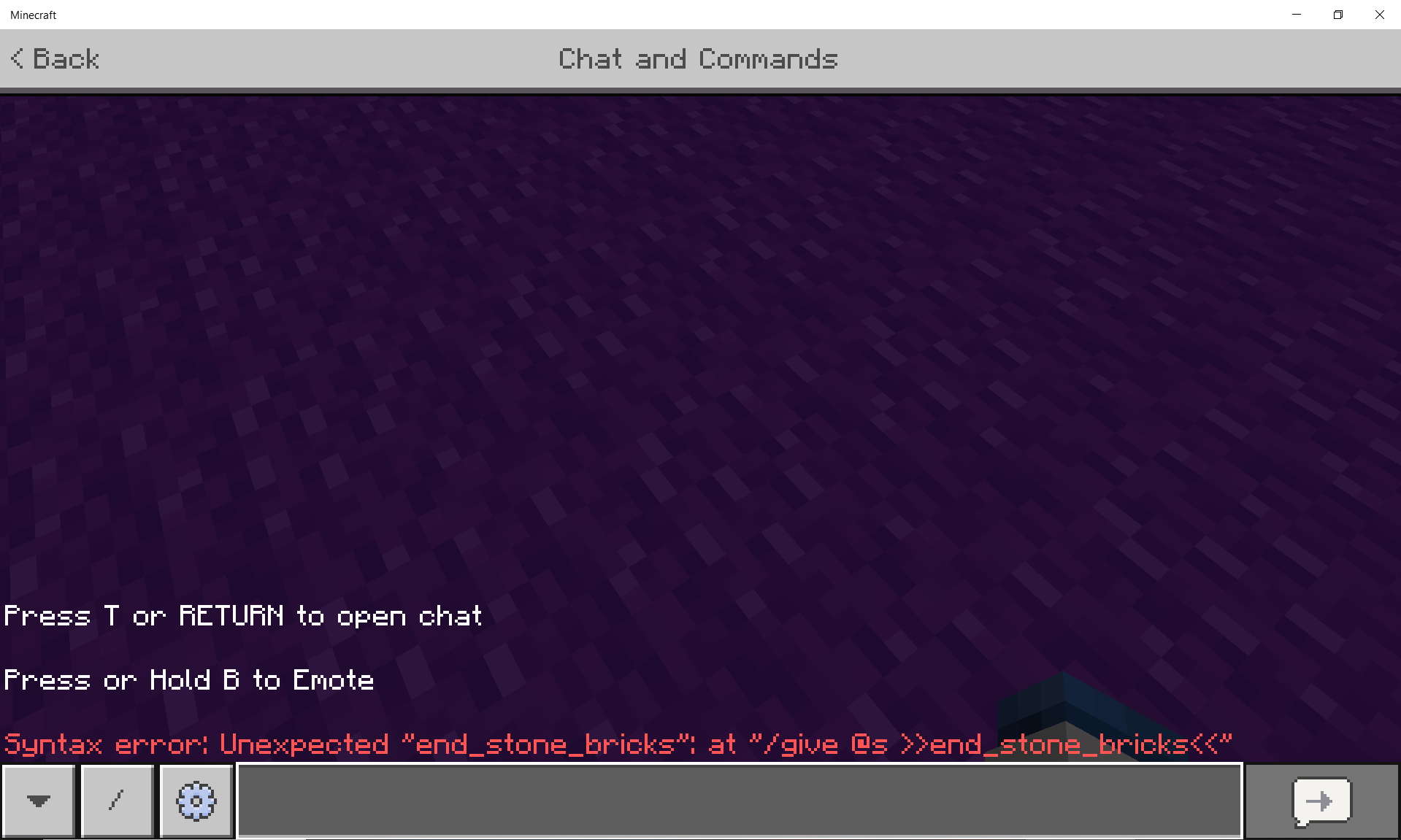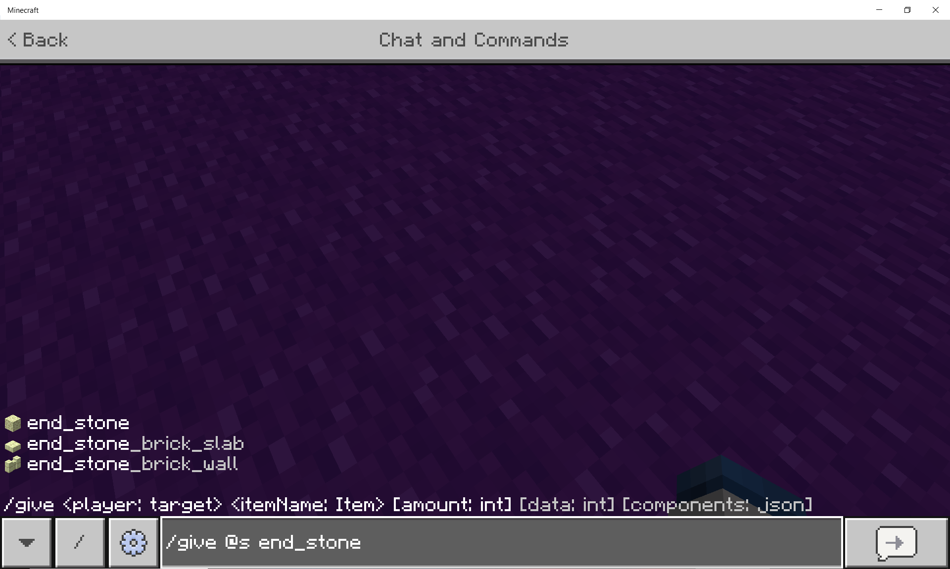 Unexpected “end_stone_bricks”: at “/give @s >>end_stone_bricks<<“