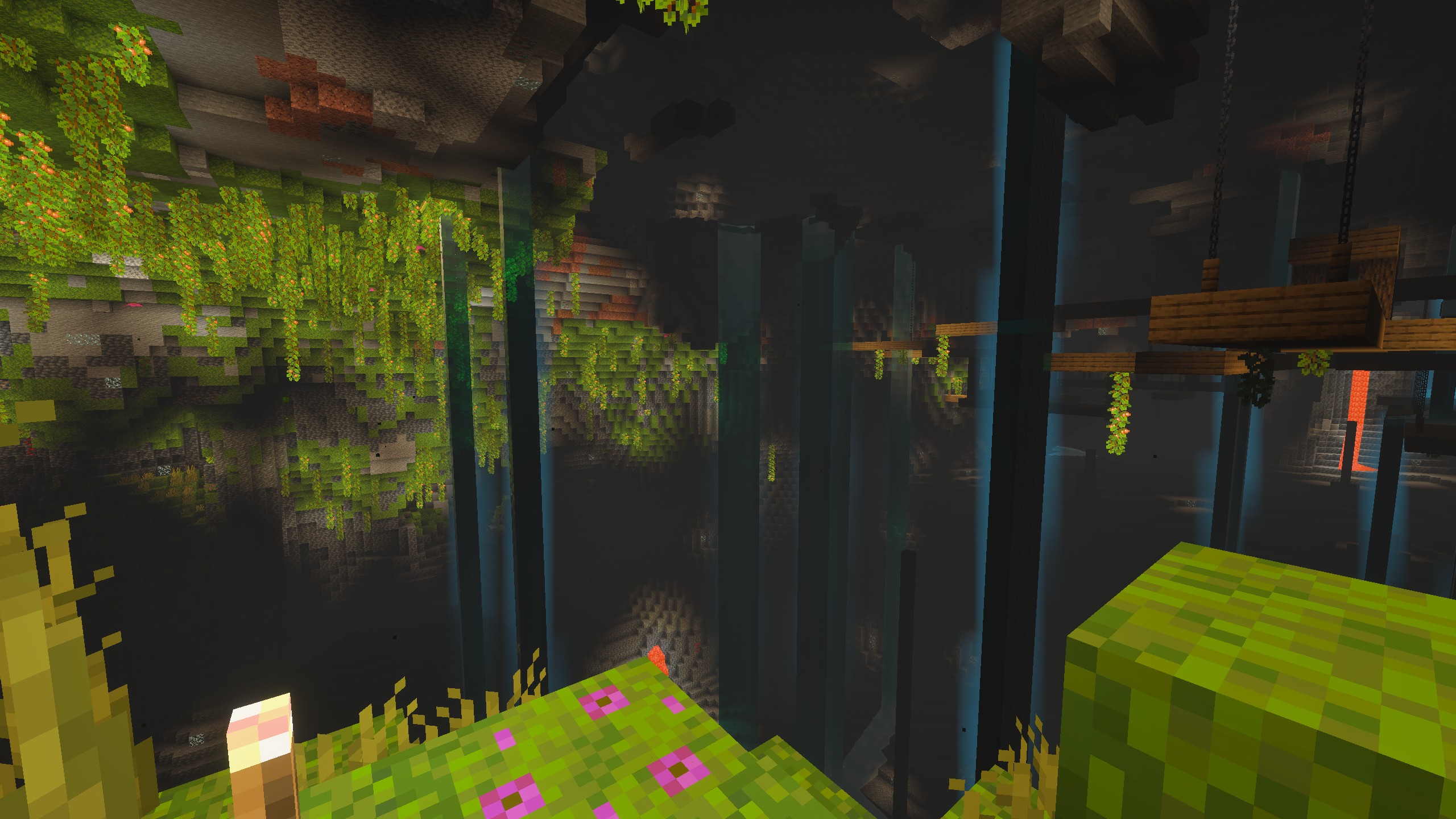 Enabling Volumetric fog causes blooming to appear around water in dark areas. The blooming is only visible when the player stands next to a light source (torch, etc.).
