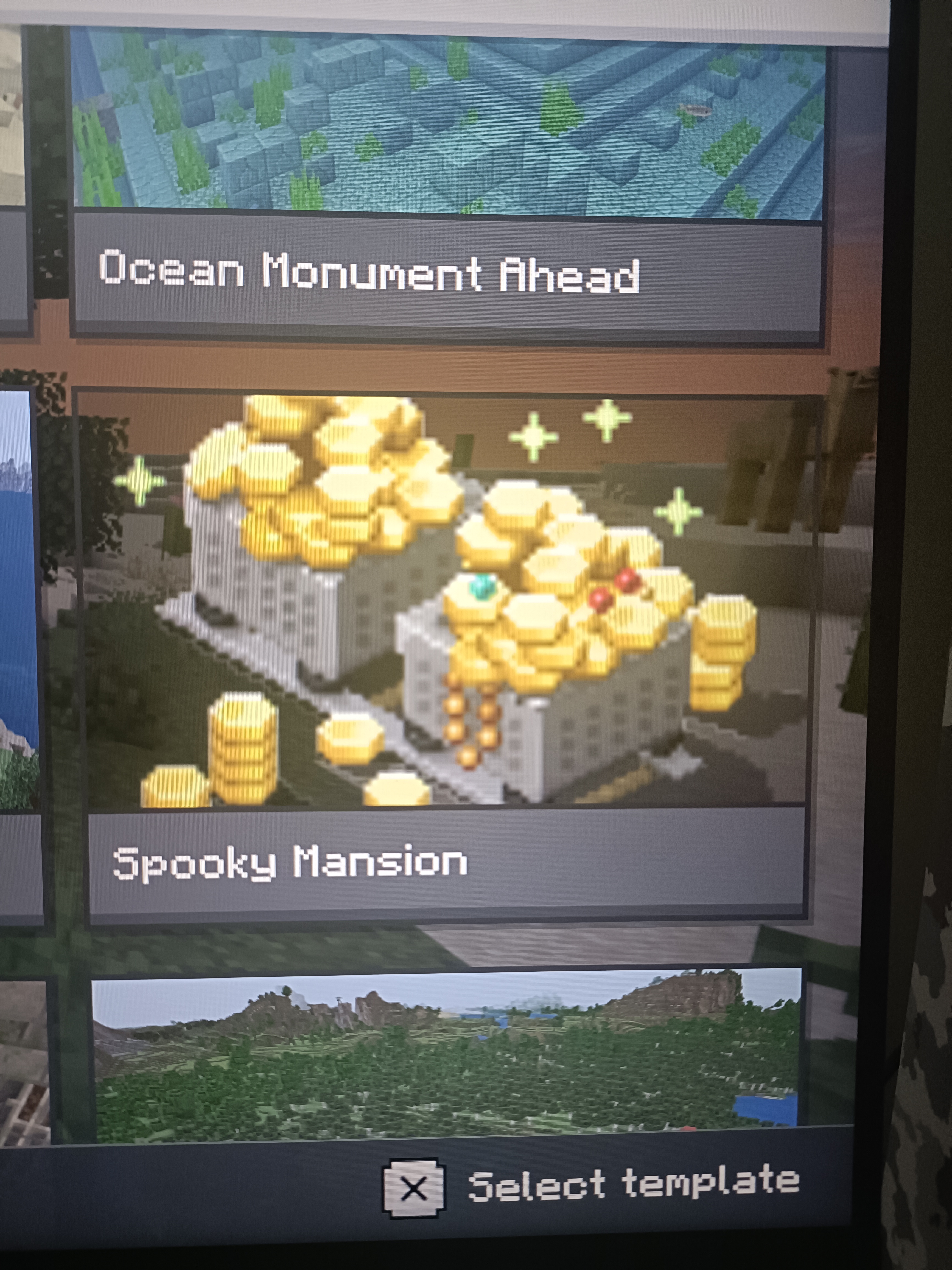In bedrock edition when you go to the seed templates menu the spooky mansion picture is with the minecart filled with minecoins from the marketplace