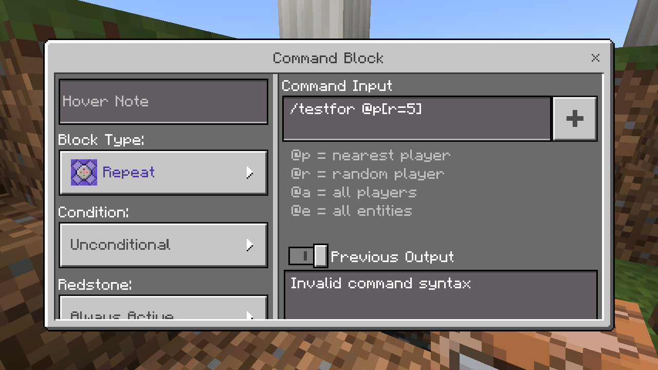 This Command: /testfor @p[r=5] Not work in Command Block