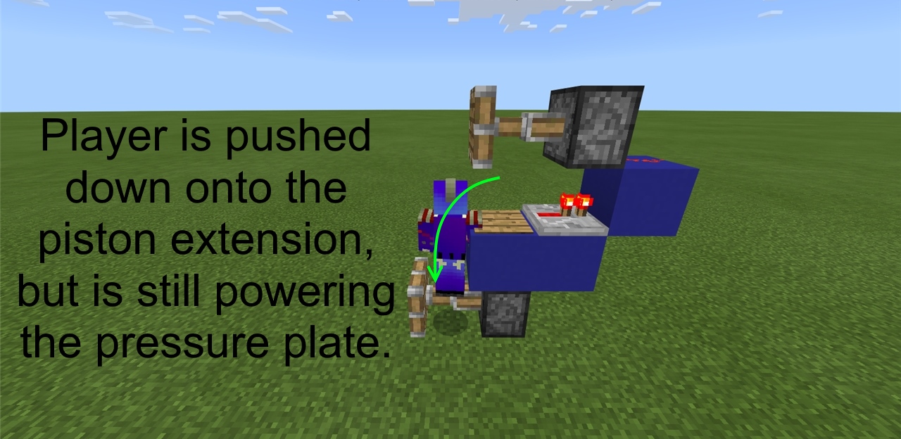 Players and mobs can continue to activate pressure plates that they were previously standing on, if they drop off the edge of a block with a pressure plate on it, onto a piston extension. The player can step off, or be pushed off by a piston. This causes particular problems when making blaze farm funnels.