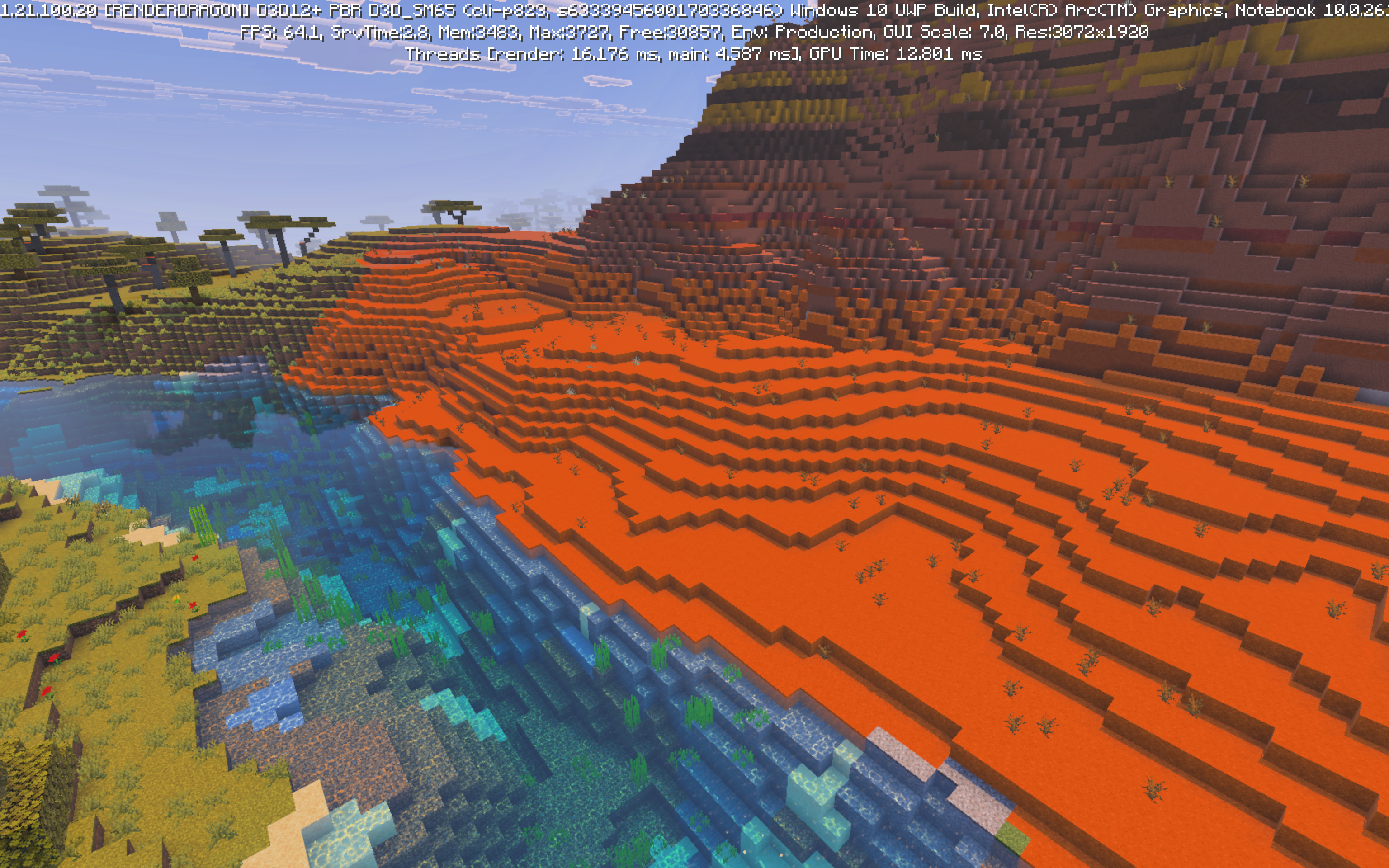 If the blocks in step 2 doesn’t seem too over saturated for you, use the locate biome command and find a mesa, or badlands in Minecraft: Java. Large patches of over saturated red sand under the sun should highlight the problem.