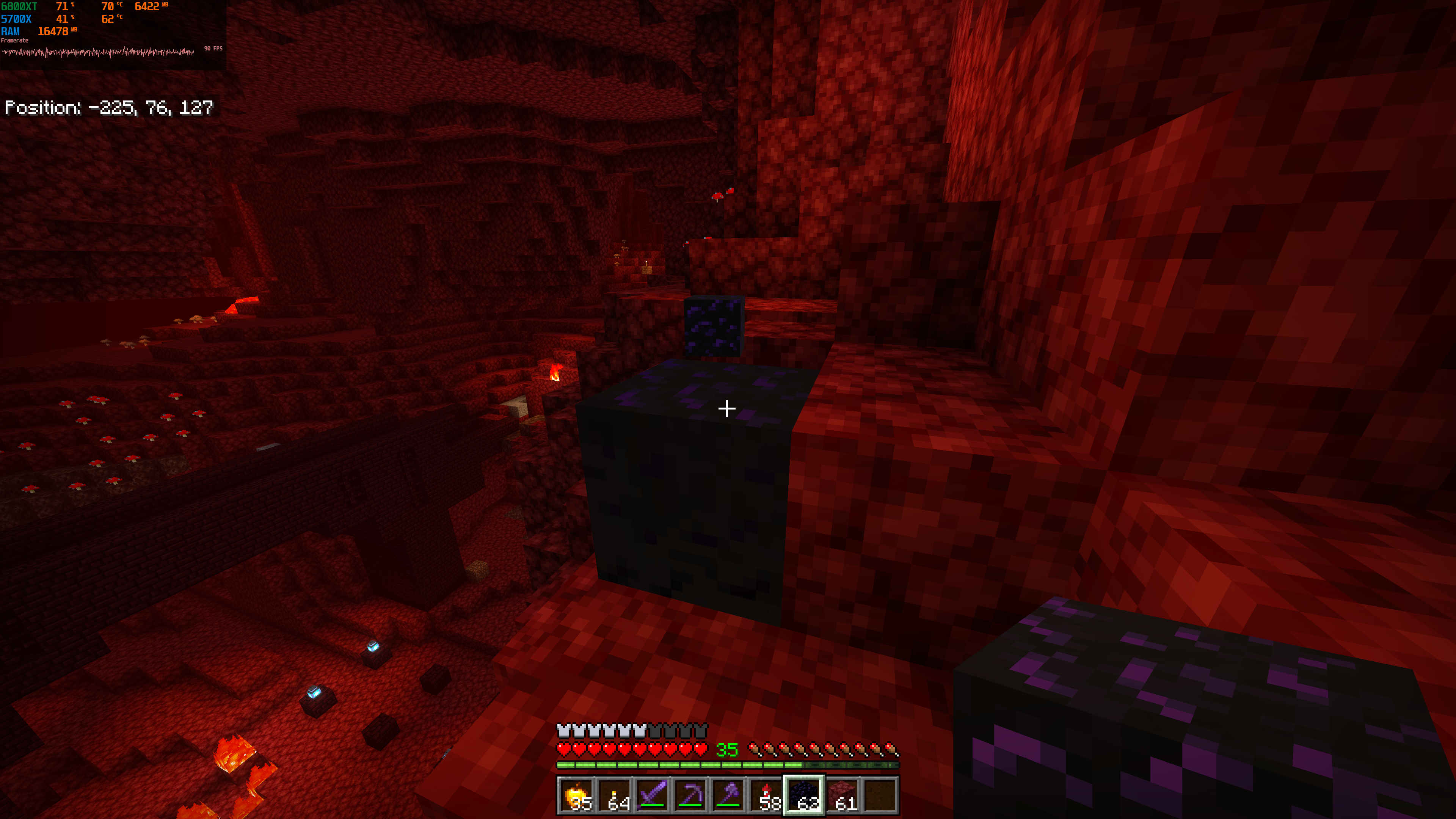 In certain environments, the obsidian texture (and some other items, like an equipped enchanted bow) has a flat, grayed out appearance, regarless if it’s a placed block, in the players hand, or floating on the ground. I’ve observed this in the nether [pictured], overworld bedrock layer [pictured], and, to a lesser extent, the desert biome [not pictured]). There is no functional issue with this issue, but it is very out place and could use a correction! 😄 Thanks!