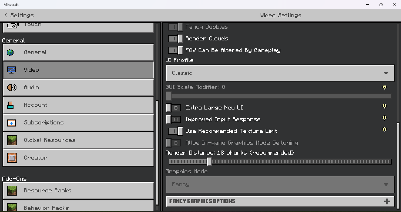When I updated my game I could not change my graphics setting from fancy to simple or vibrant visuals its just greyed out and my friend has the same problem but they are stuck at vibrant visuals and they can’t change it, we have tried to reinstall the game but it didn’t work can you please help