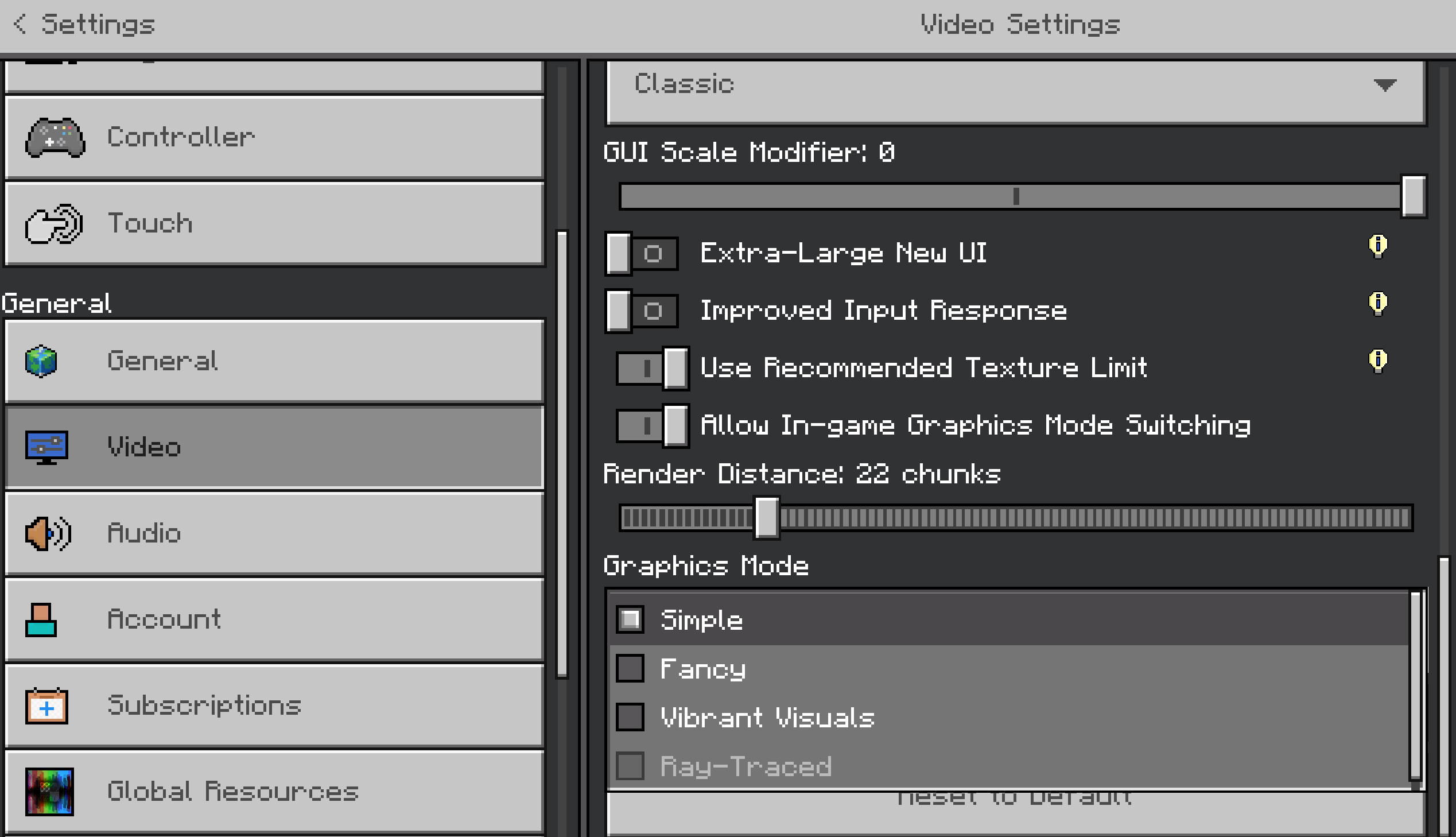 Additionally, it is not possible to switch to ray tracing mode in the main menu, even though I have added the RTX resource pack to the global resources.