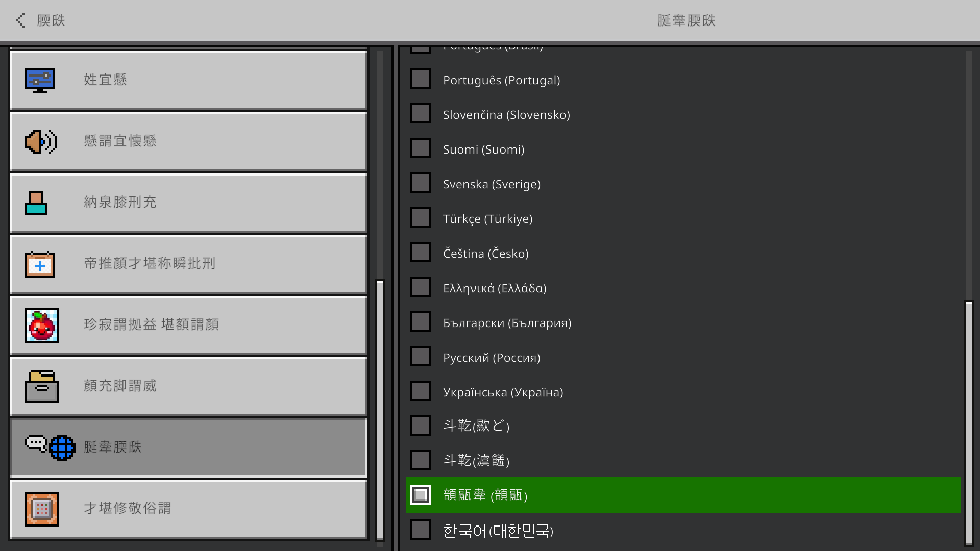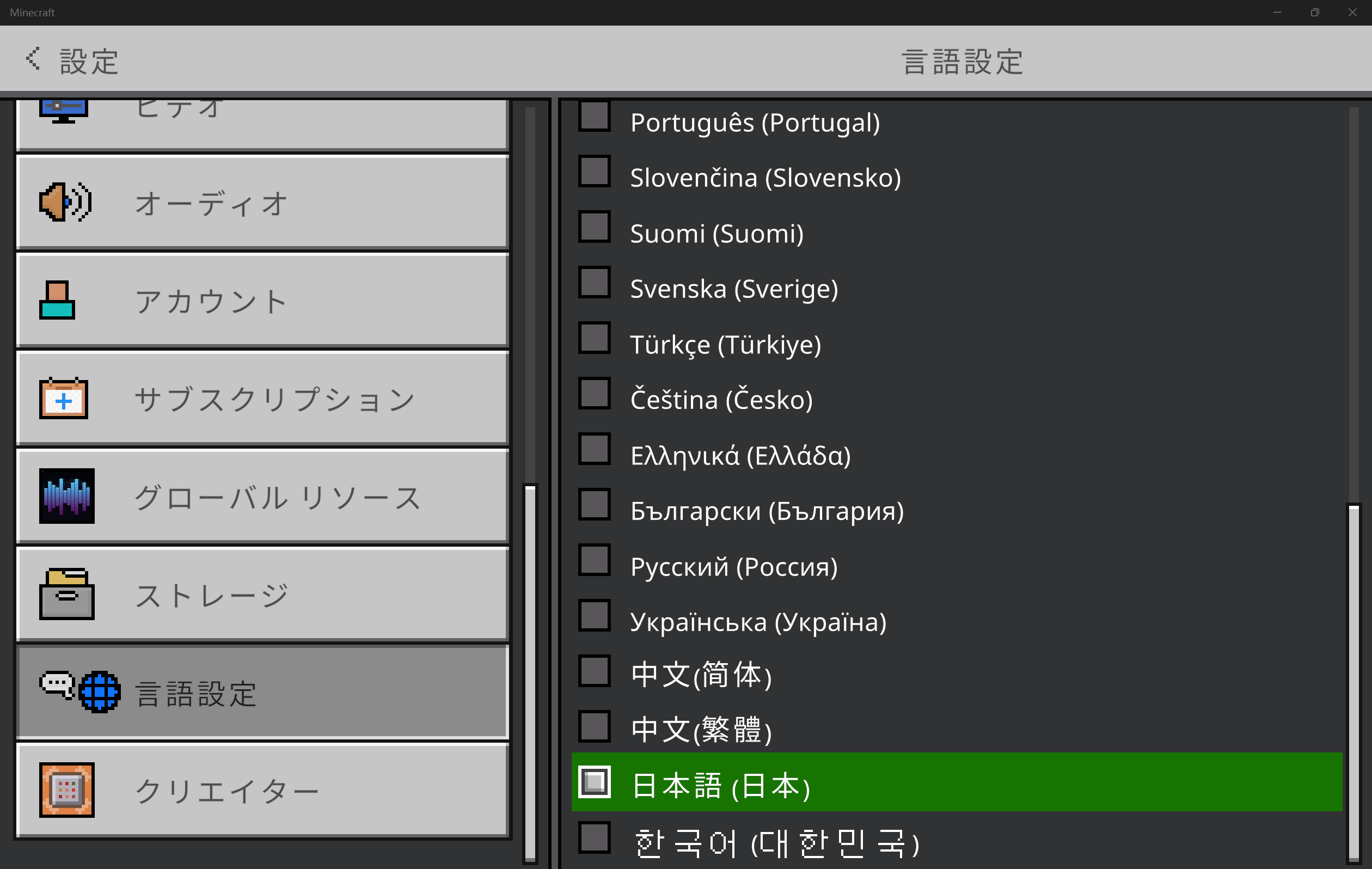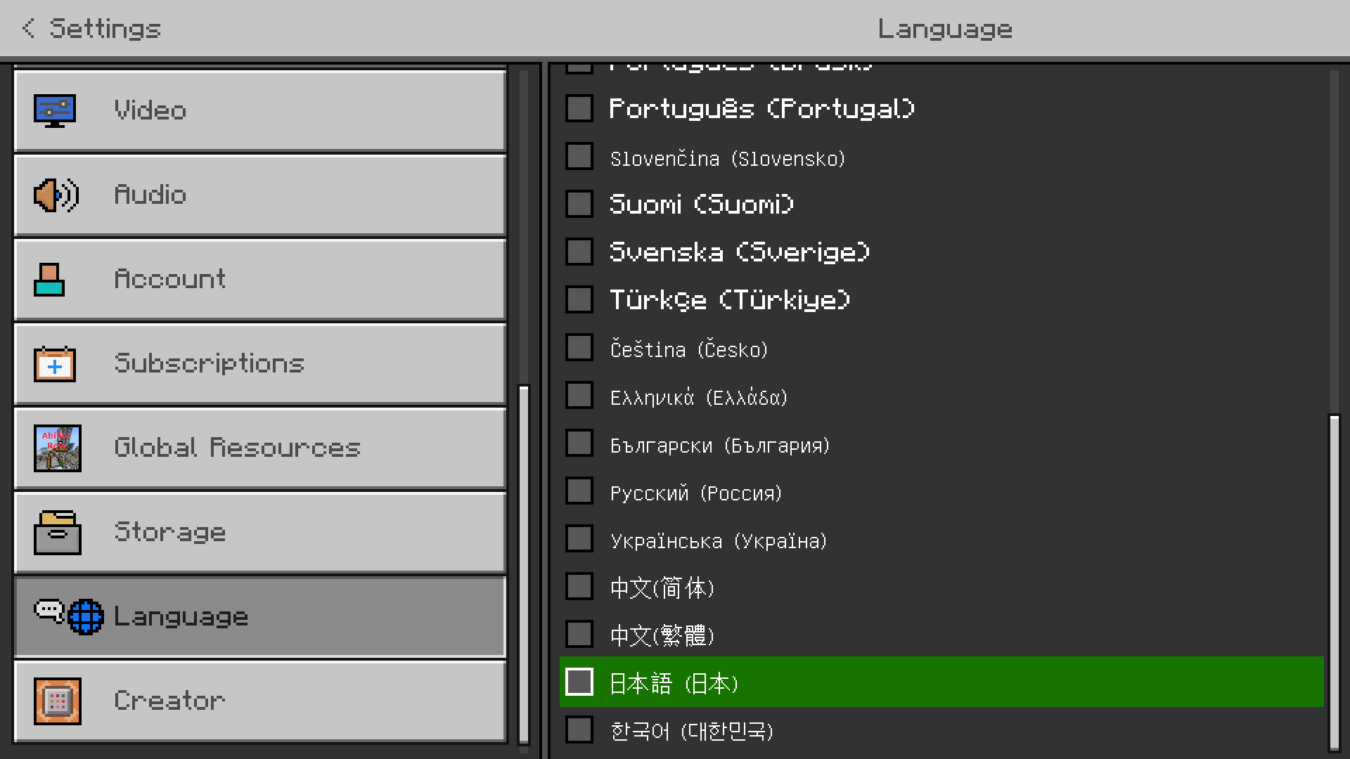 This has been the case since the previous version. For some reason, when I select Japanese, I get a non-existent language like Chinese. This language is different from any of the several Chinese languages in Minecraft. It also has “hiragana” mixed in, which is not present in any language other than Japanese, creating a kind of garbled character set.