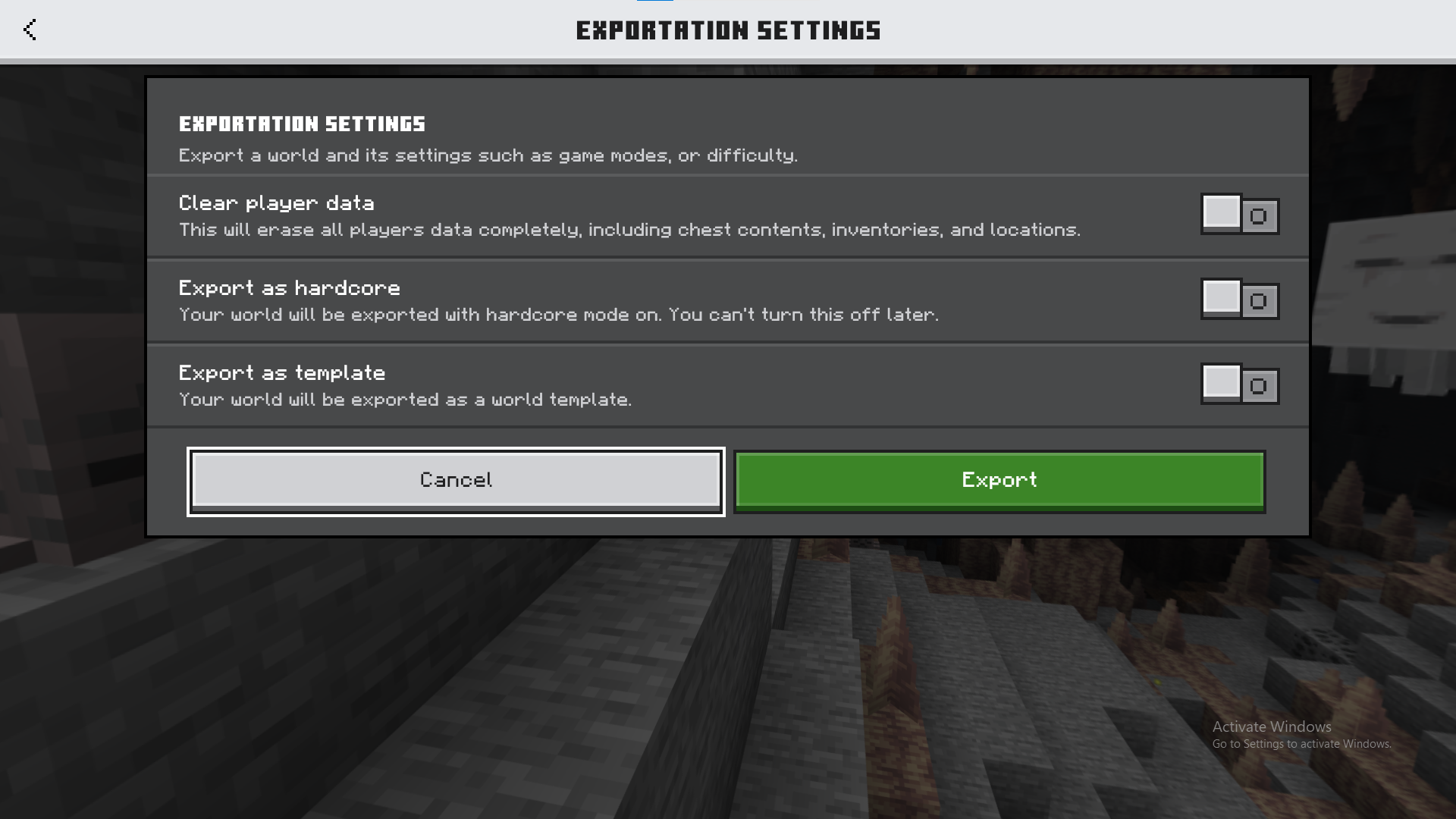 When a user is exporting a world there is a “Export World“ screen shown with a “Exportation Options“ panel presented that displays three toggle buttons (on Preview only the first of these is shown). Of these, the first says “Clear player data“, with the subtext “This will erase all player data completely, including chest contents, inventories, and locations.“ This subtext should instead say “This will erase all player data completely, including ender chest contents, inventories, and locations.“ because activating that option does not clear chest data but only ender chest data.