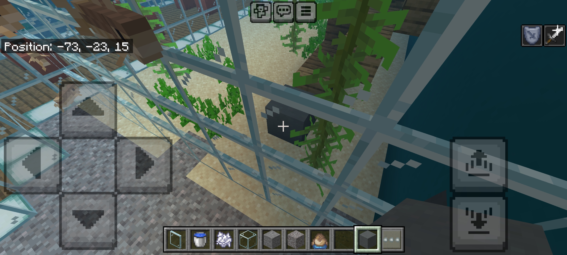When looking slightly down and to the side at glass panes, the player is able to interact with blocks on the other side (breaking blocks, interacting with blocks with UIs, and placing blocks)