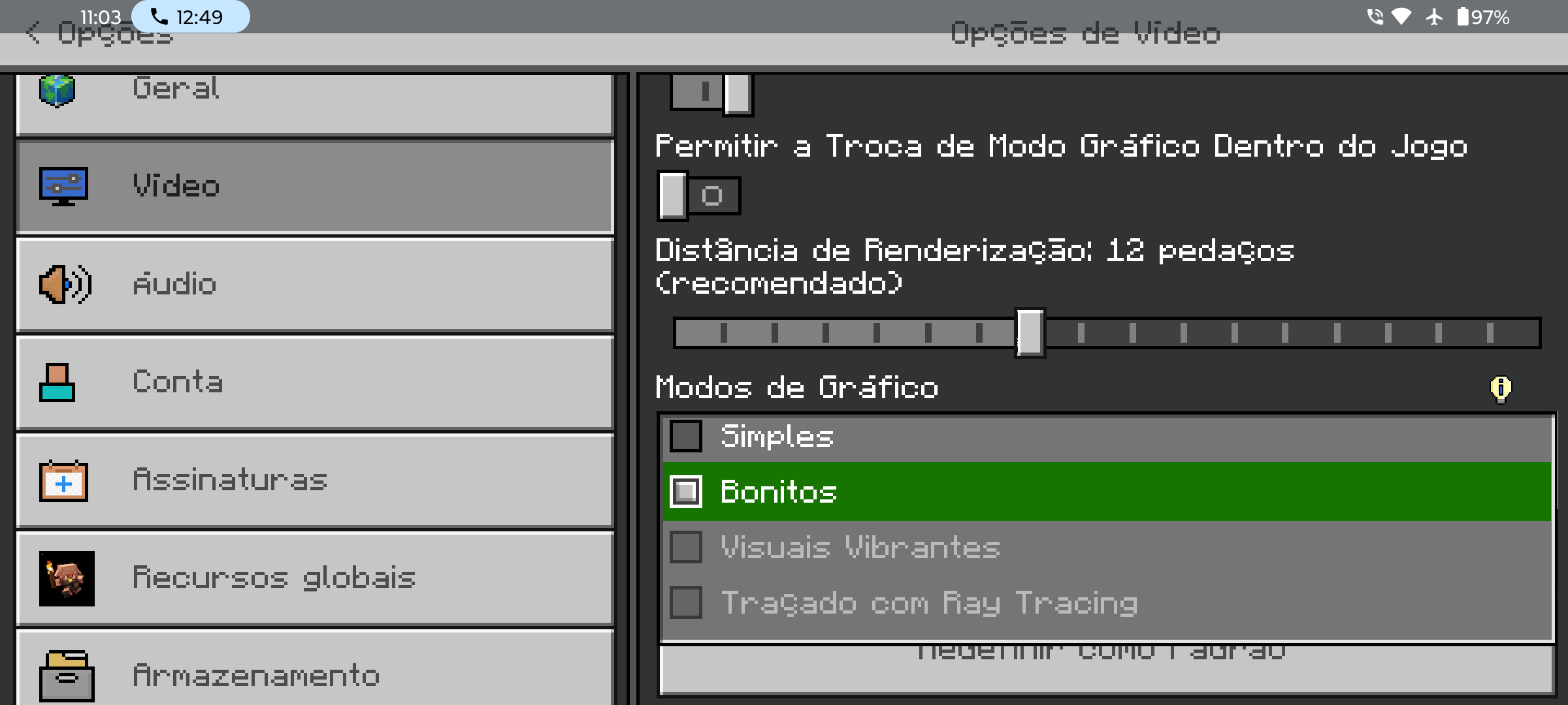 Sobre os visuais vibrantes, por algum motivo o Minecraft não deixa eu selecionar eles, mesmo meu celular (Moto G84) contendo 10Gb de RAM(com ram plus), adreno 619, Chipset qualcomm snapdragon 695. Aparelhos com recursos mais limitados estão conseguindo rodar o jogo nesses gráficos sem dificuldades. Então peço que vocês dêem uma olhada nisso, por que essa limitação para o meu dispositivo não faz o menor sentido.