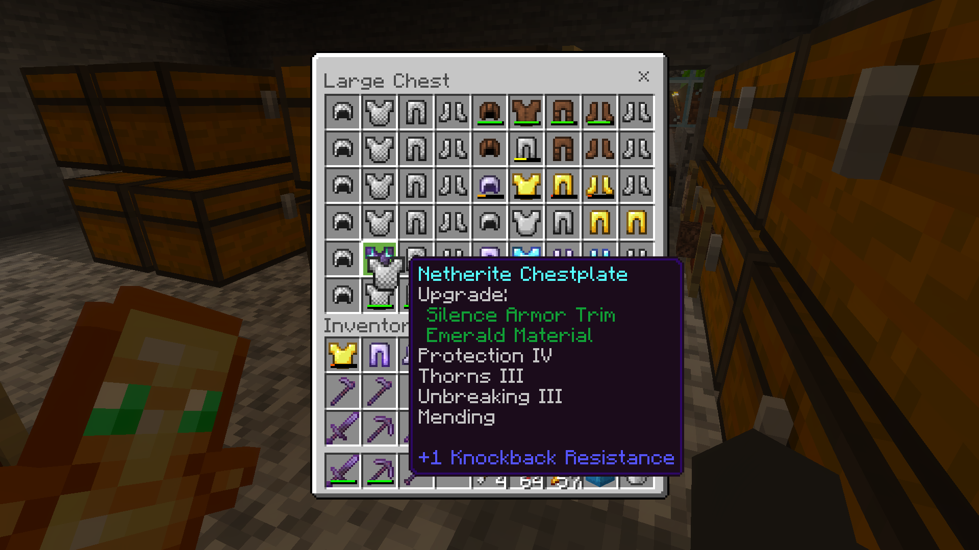 To reproduce easily, place an untrimmed armor piece in a chest. Then, selecting a trimmed armor piece, replace the untrimmed armor, then switch again. the untrimmed armor will appear trimmed with the same material as the trimmed armor.