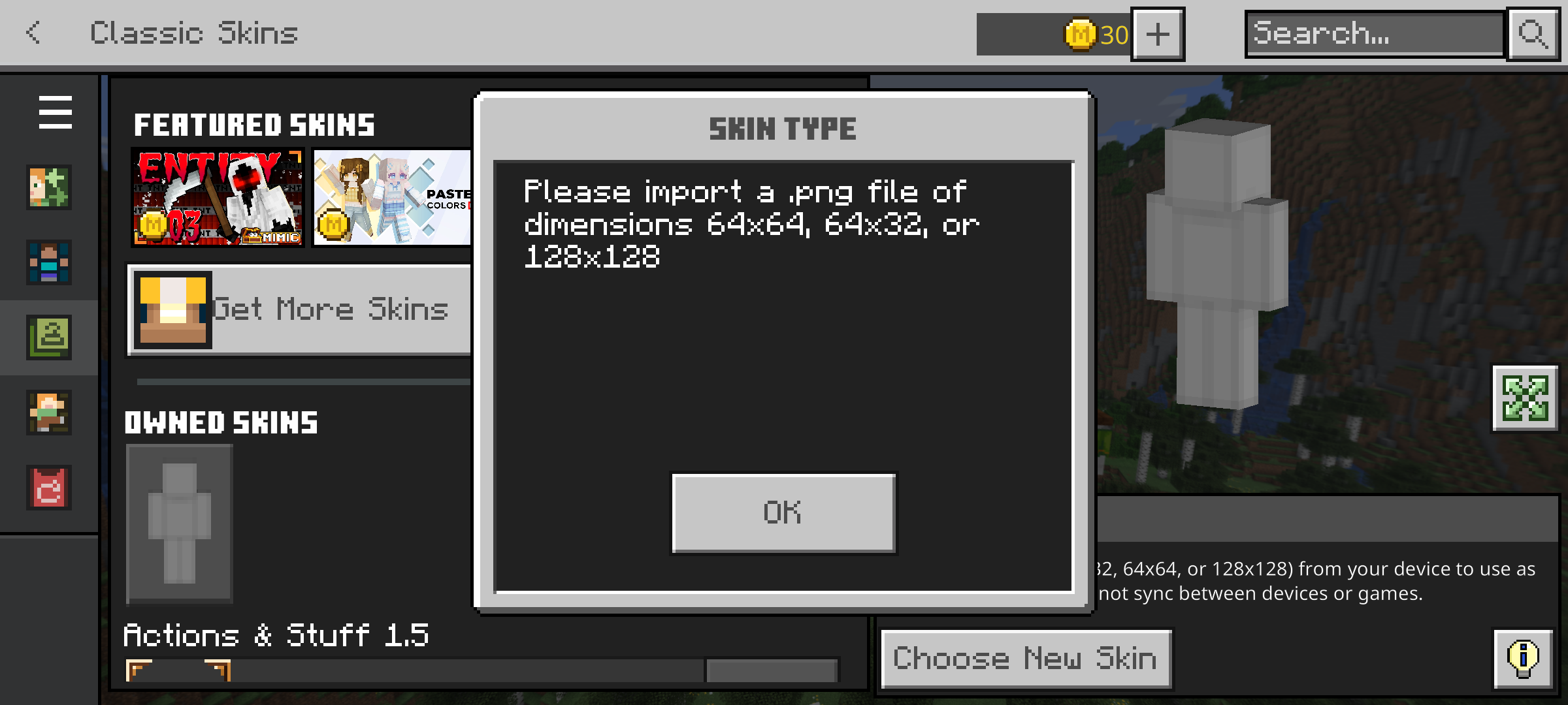 Whenever I try to upload a classic skin, I get a popup saying “Please import a .PNG file of dimensions 64x64, 32x32, or 128x128” even though my skin is a .PNG file and the dimensions are 64x64.