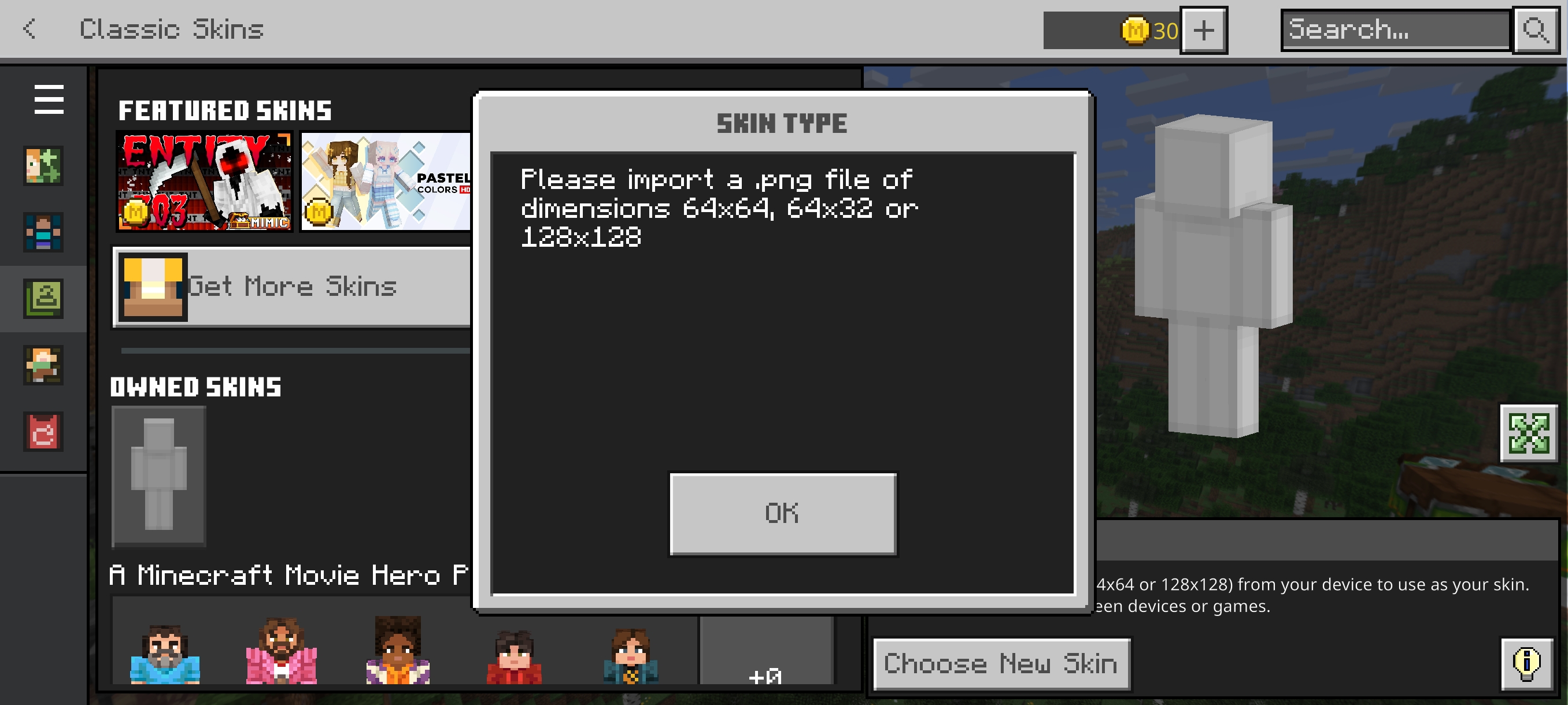 Literally can not load a skin for myself to use. Trusted skins is disabled already, but it didn't make no difference. I am trying to import a 64x64 png file, but the game for some reason says “i should upload a 64x64 png file” (see attachment). after about half an hour of going back and forth with no result i come to you with this problem that you can hopefully resolve.