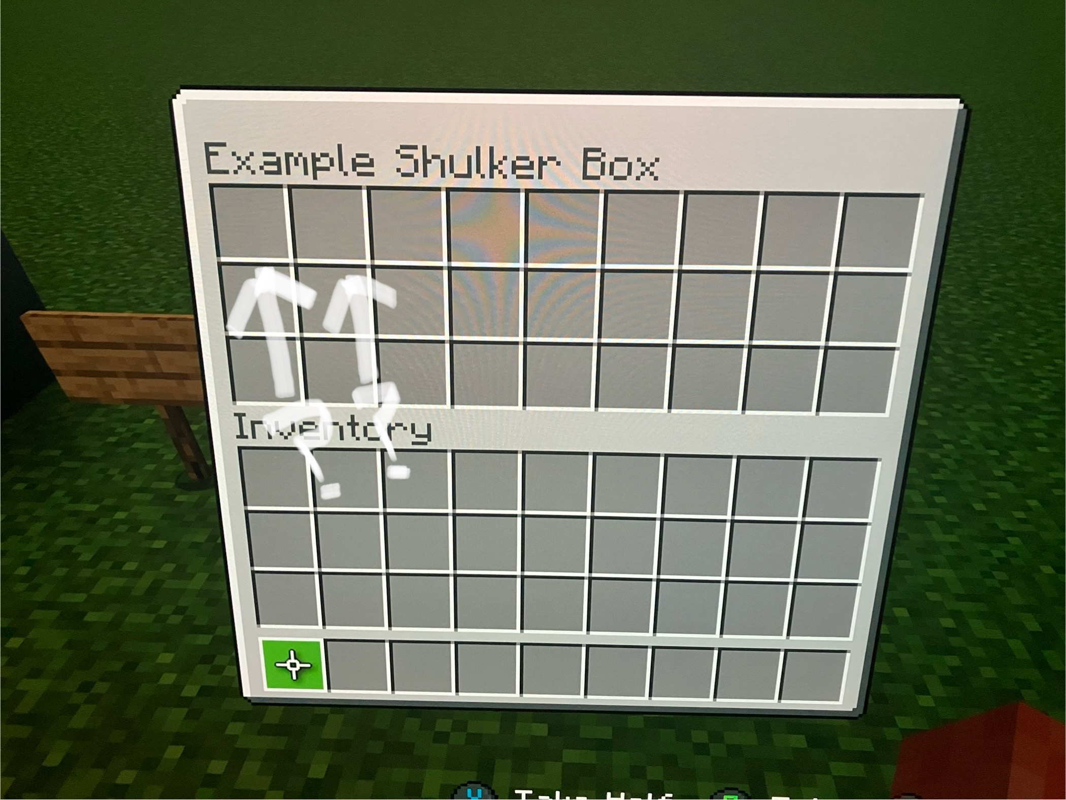 Then, click the shulker box and place both red sandstone and purpur slabs from the hotbar into the slots on the shulker box interface.