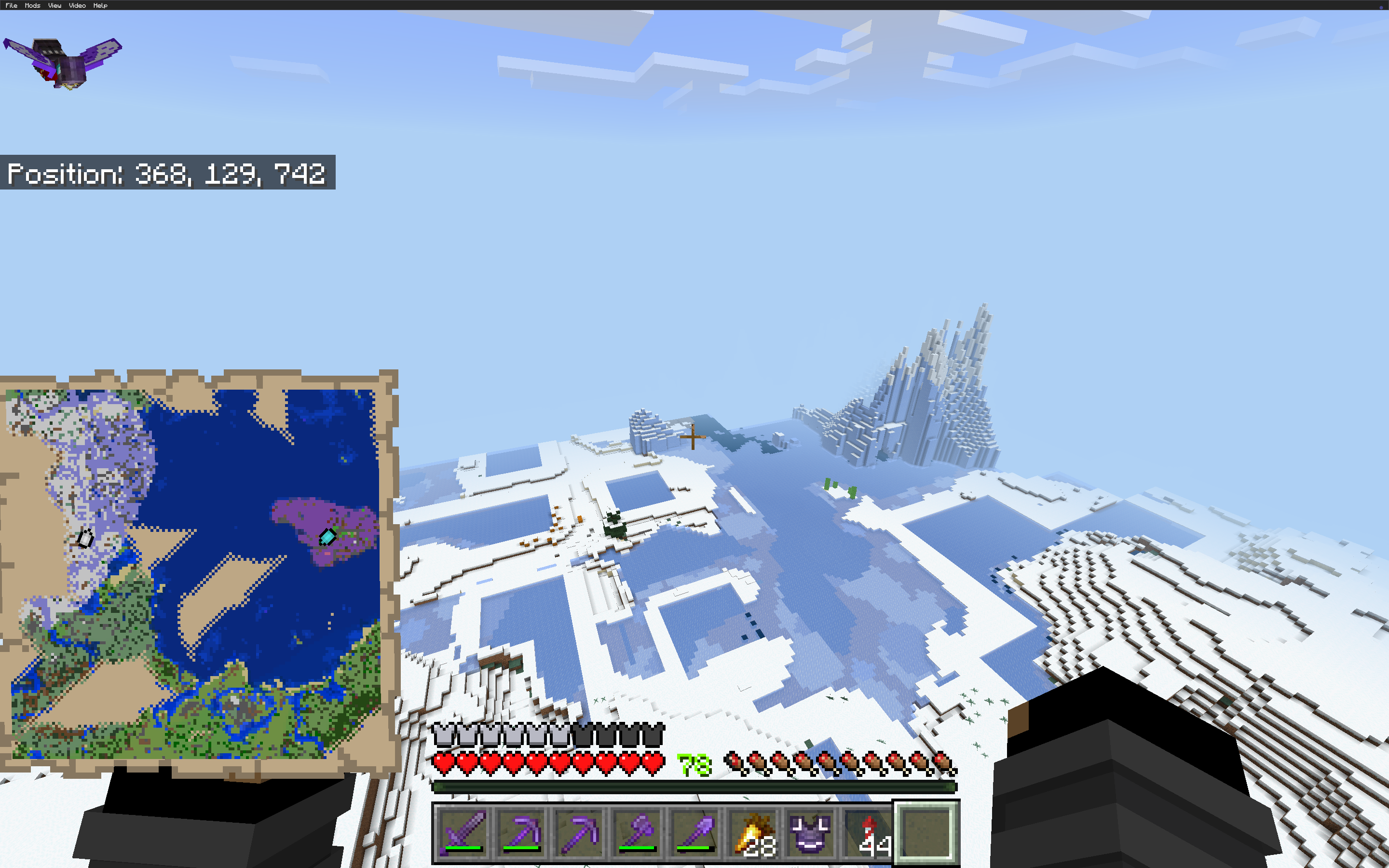I was in a realm flying my elytra towards spawn when I came across the terrain generation start bugging causing chunks to fill in with different chunks, It ruined a large section of the biome. Things like ice glaciers getting swapped with stone and shipwrecks and structures from underwater spawning on top of the frozen oceans, as well as snowy plains biomes loading in ice chunks causing weird looking terrain. Below if you look at the map in the player’s hand you can see the changes between previous generation (before 1.21.100) and after updating to 1.21.100 (the nether image shows before the bug)