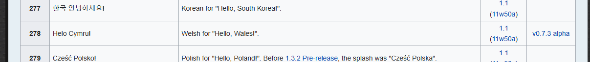 The "Helo Cymru!" splash text exists, but the following are missing: "日本ハロー!", "한국 안녕하세요!", "Cześć Polsko!", "你好,中国!", "Γεια σου Ελλάδα!".