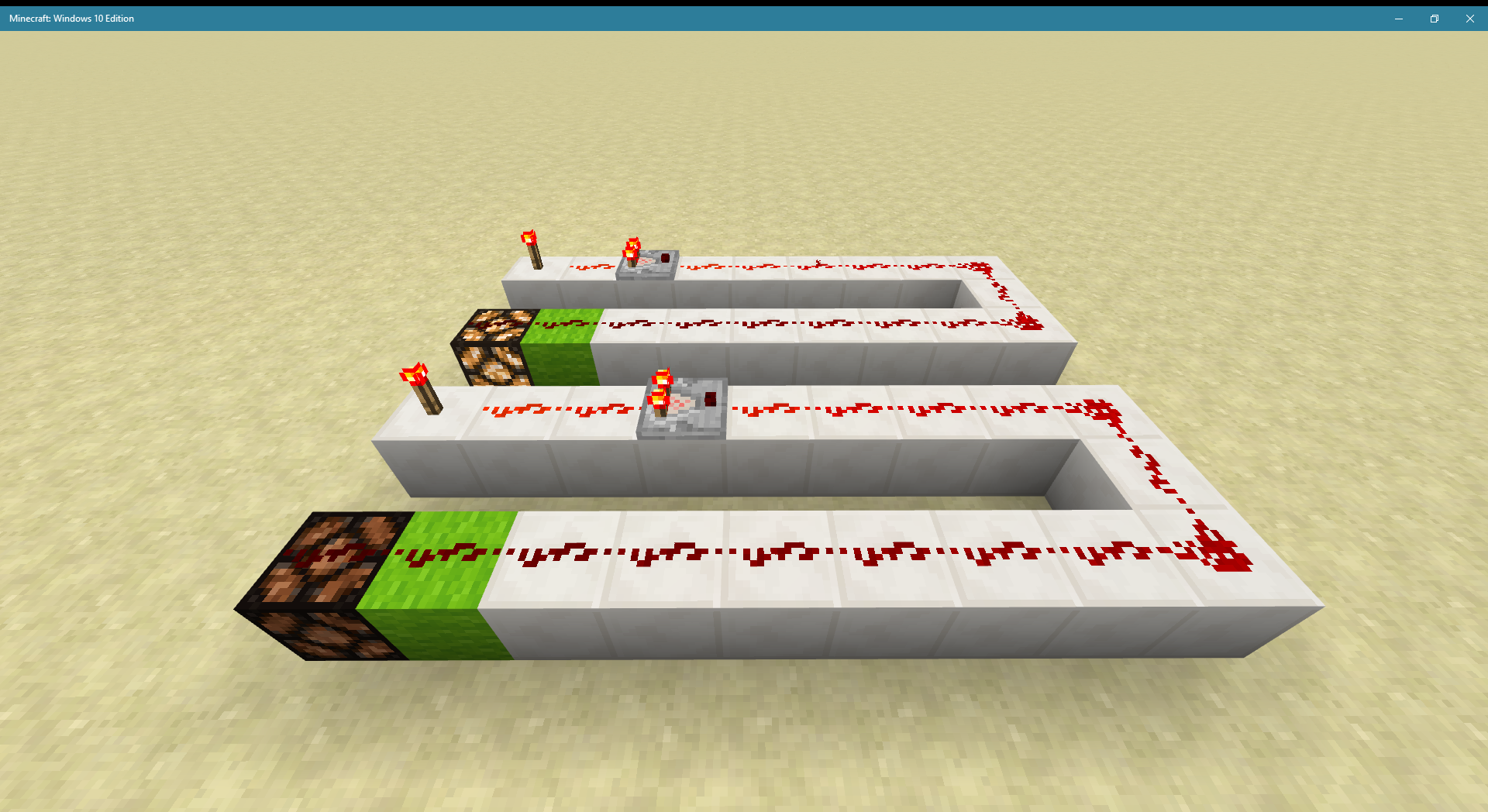 The "With redstone dust" image shows the same circuits with a redstone dust added to the top of the lamps. In the top circuit, where the comparator is powered at level 15, the lamp continues to be lit, which is correct. But in the bottom circuit, where the comparator is powered at level 14, the lamp is dark, even though it is being powered by the green block.