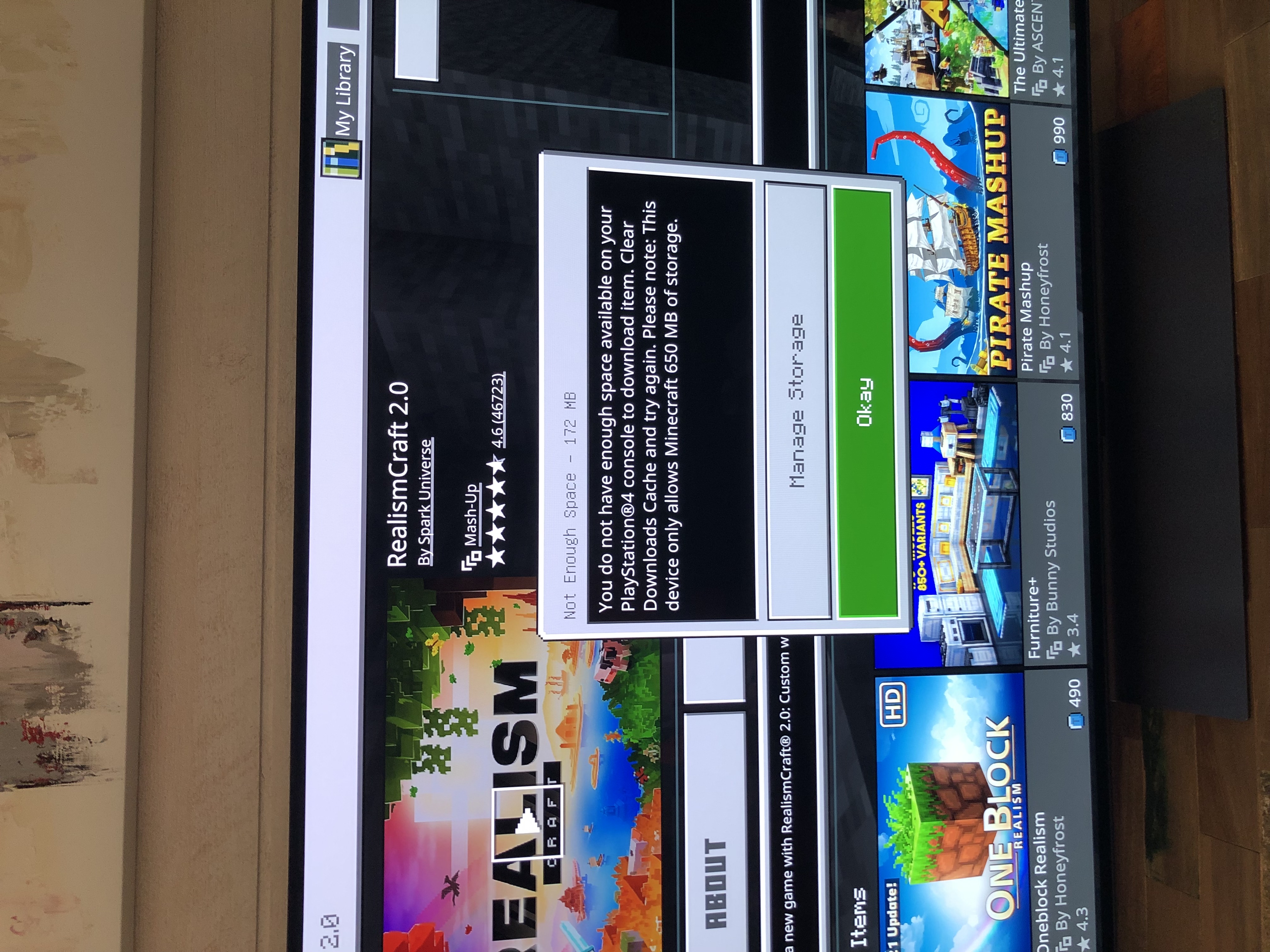 I want to update a mash-up (Realism craft) but It tell me that i don’t have enough space on my PlayStation. I check on my minecraft storage and playstation storage but everything is fine. I try to download other mash up but i got the same problem.