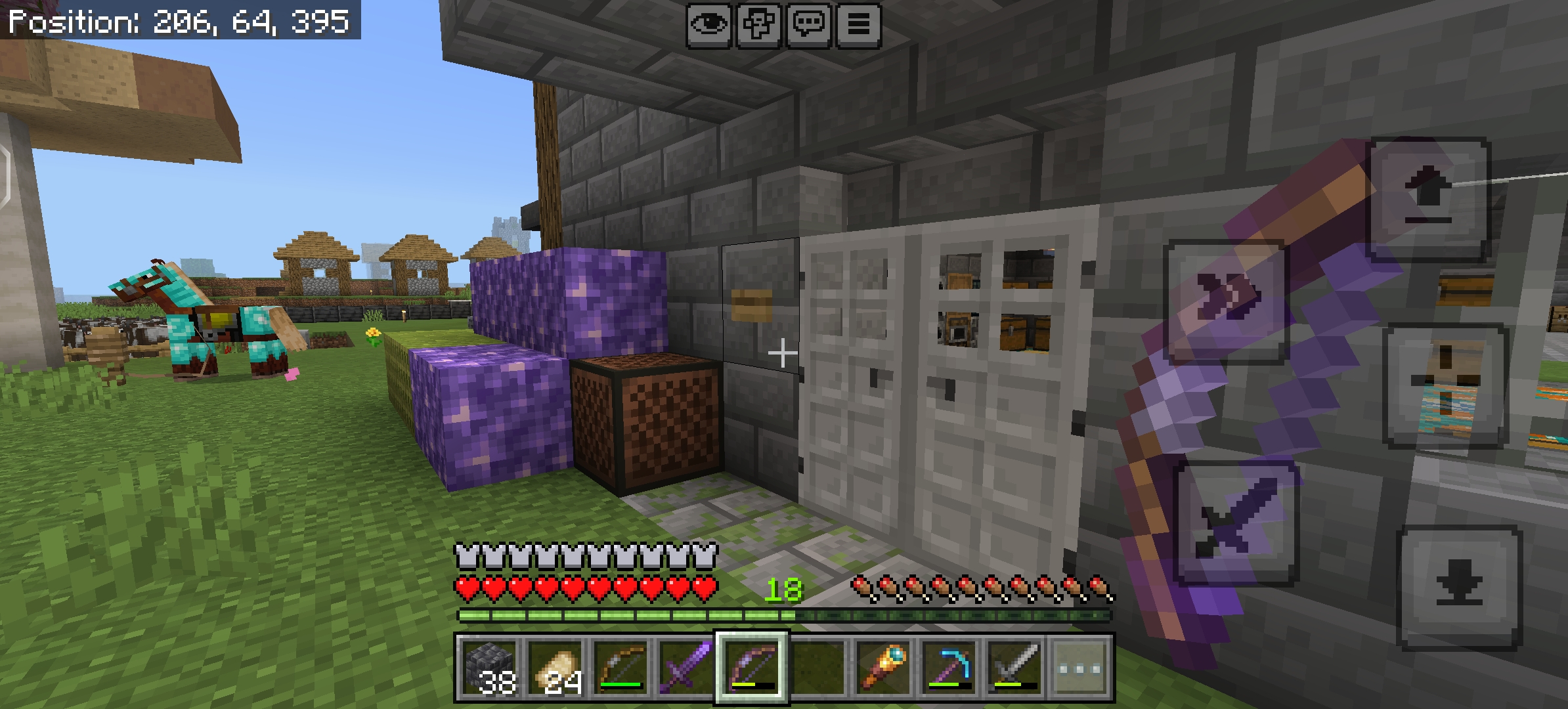 When holding an enchanted bow in the main hand (on touch controls in Minecraft Pocket Edition/Bedrock), the hand and bow display incorrectly. The bow overlaps strangely with the hand UI, making it look broken or misplaced.