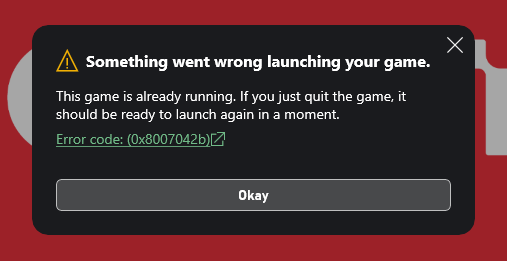 When the game is closed and then reopened within a few seconds, an error message appears: