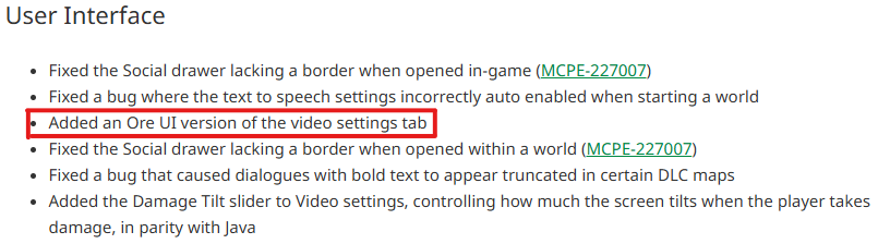 In the Preview 1.21.130.24 changelogs, under the User Interface section, it says that Video settings has been updated to Ore UI, but when opened in the game the Video settings still use JSON UI.
