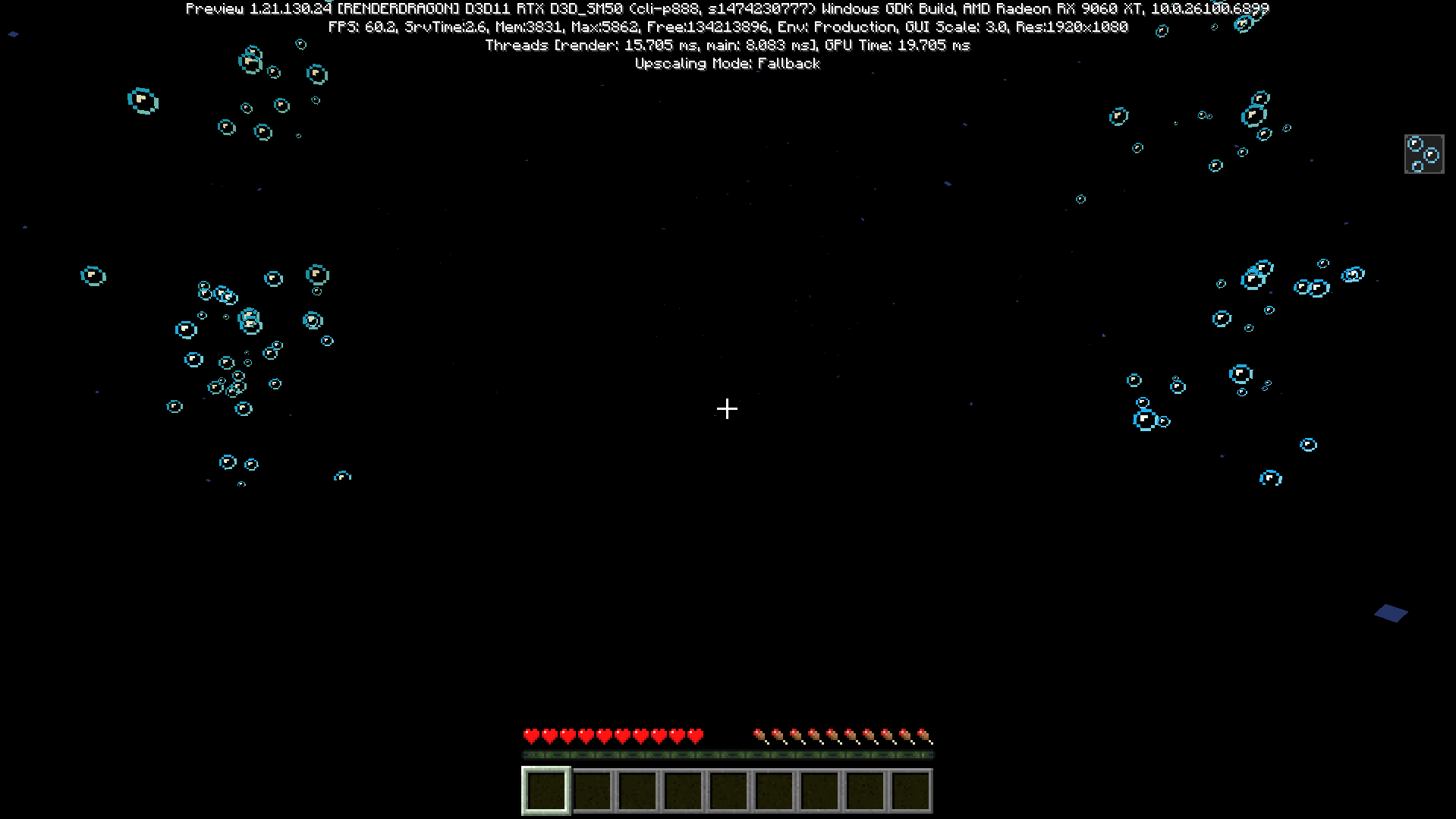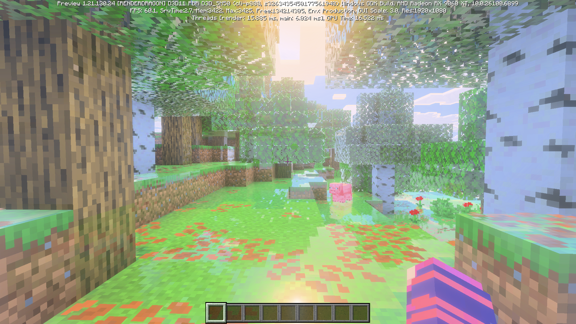 Enabling Vibrant Visuals results in multiple visual bugs, such as everything appearing very bright and block textures all appearing shiny/reflective, while enabling Ray Tracing results in everything except for particles and UI elements appearing pitch black.