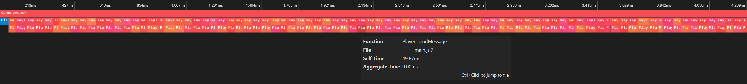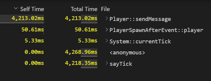 Executing 1 native (@minecraft/server) function a tick shouldn’t result in a self-time of ~50ms. My test result shows 50ms for 1 simple Player::sendMessage per tick. The PlayerSpawnAfterEvent which is used to start the runInterval is also 50ms. So it looks like the profiler stops the captured time when the current tick ends and not when the function actually is done.