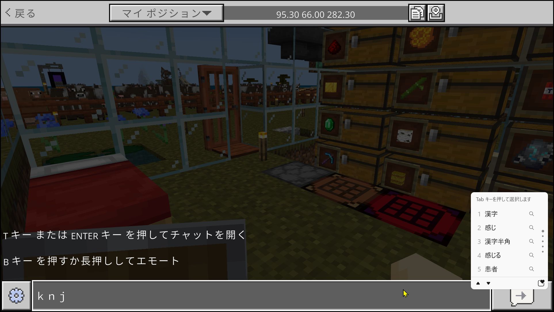 この時一度Alt+Tabで別のウインドウに切り替えてまたマイクラに戻って来ると、”かんじ”になっています。