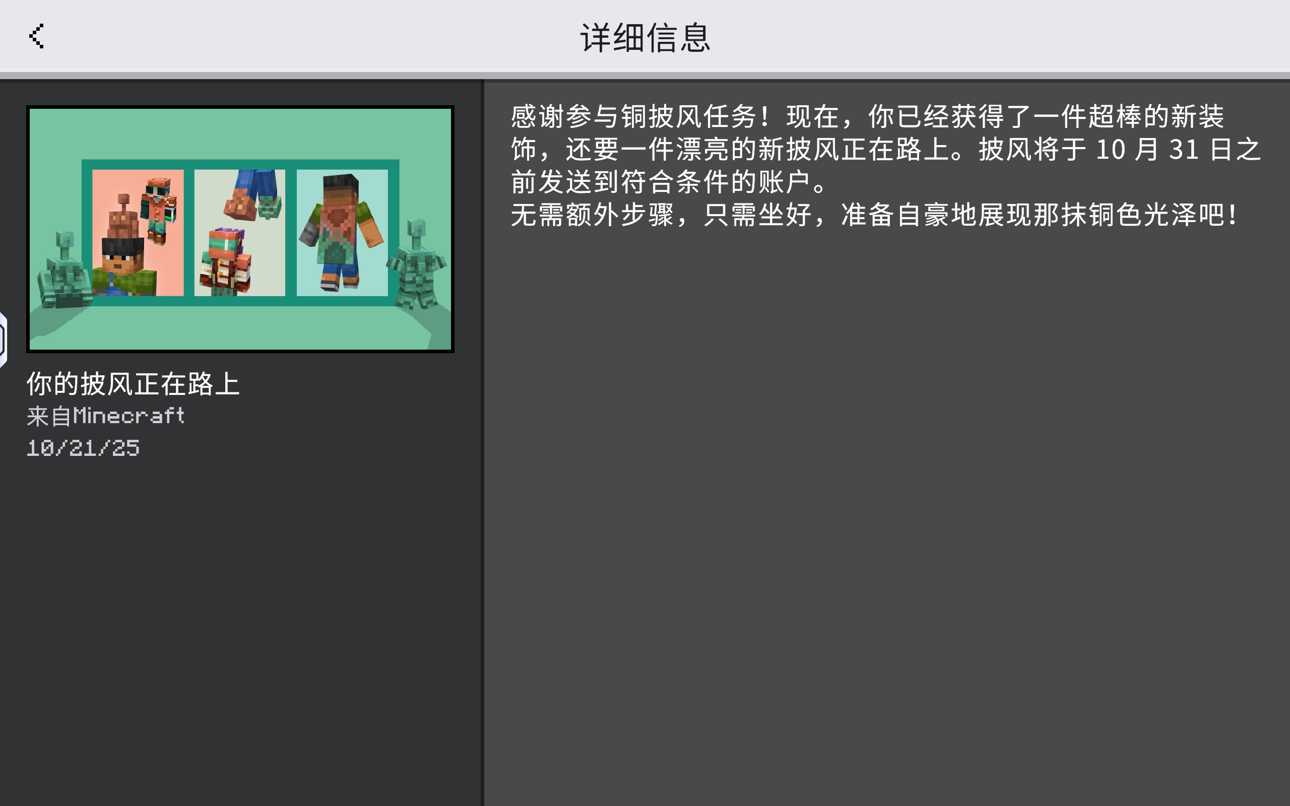 I completed the Copper Cape quest in the Bedrock Edition but did not receive the Copper Cape.Although I received the message that the task was completed
