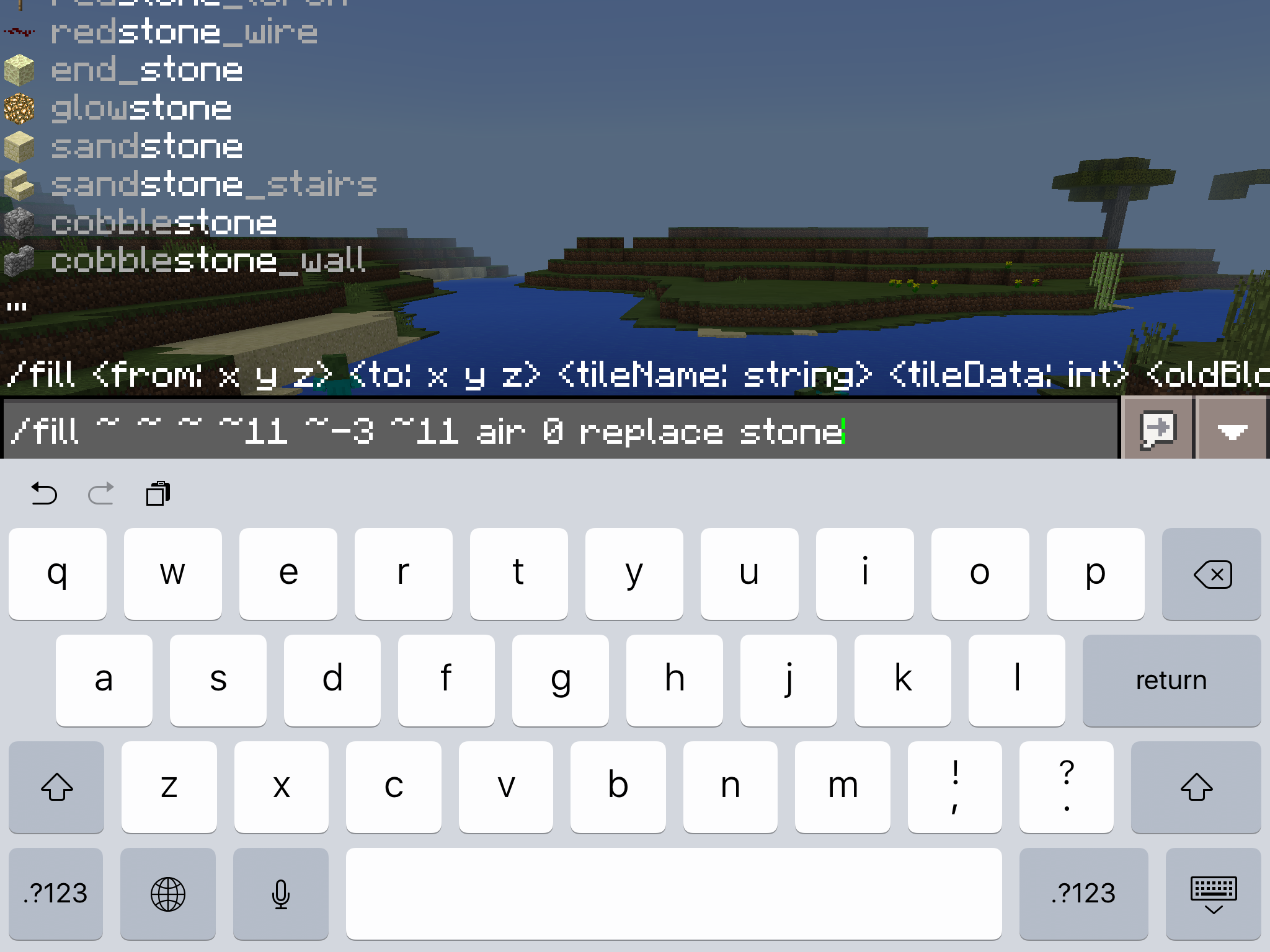 When I type this command: "/fill ~ ~ ~ ~11 ~-3 ~11 air 0 replace stone" It gives me an error, saying that the command syntax is incorrect.