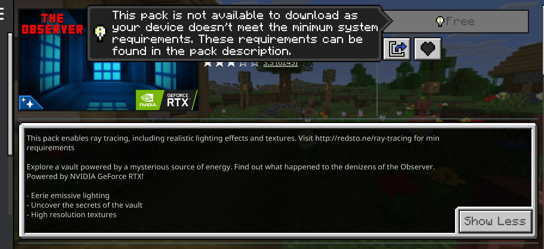 I am running a brand-new Asus ROG Strix with a NVIDIA 5070, 32 RAM and 2 TBs of memory. I have a supercomputer. I can see the RTX packs in the Minecraft marketplace (bedrock/PC), but it says my system does not meet the minimum requirements (?!!!!). I have troubleshooted everything I can think of. Everything is up to date (game, drivers, system). I have disabled V-Sync. I have deleted and reinstalled the game. I can’t find anybody with this problem or any clear solutions. Any help would be great. Thanks