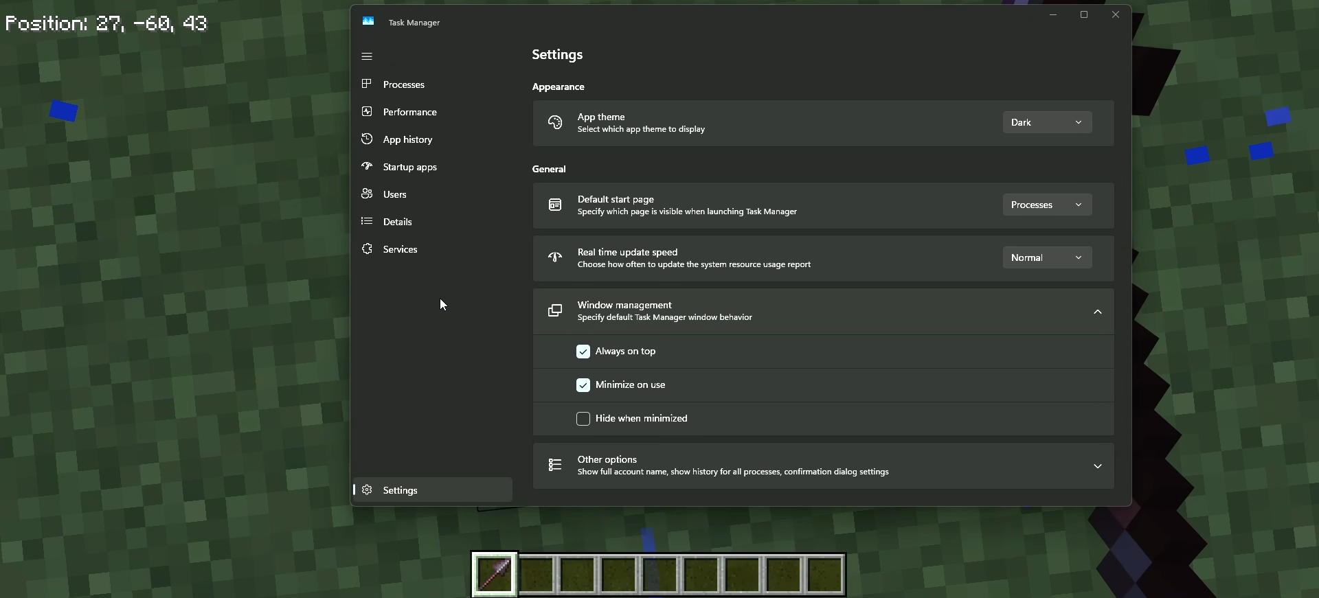 In Task Manager, go to Settings > Window management and enable Always on top.