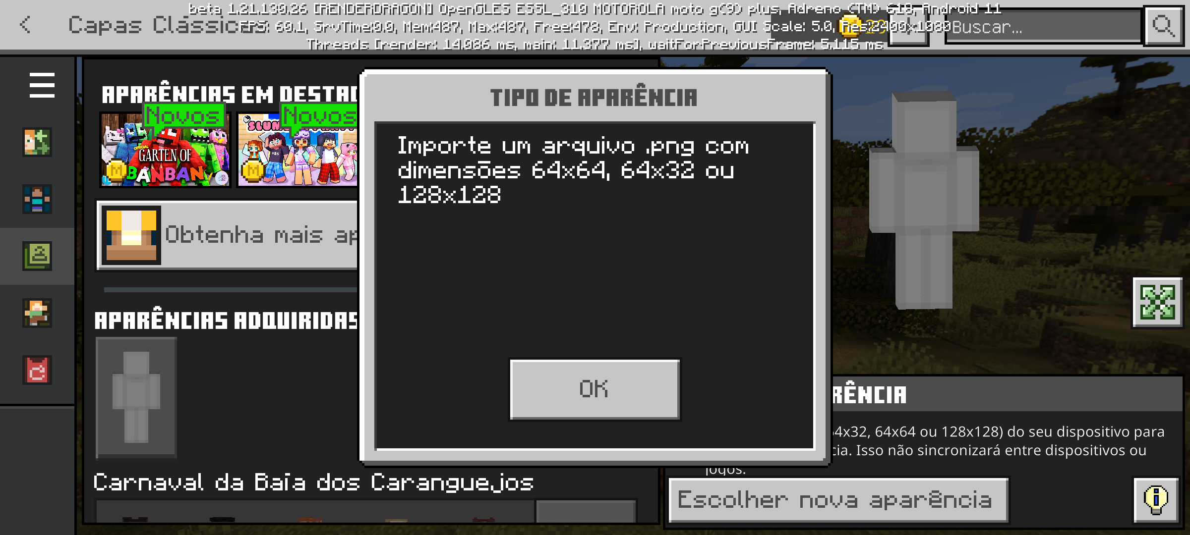 After the 1.21.130 update, Android players are unable to import custom skins, despite the skin meeting the requirements. The following error message is shown: