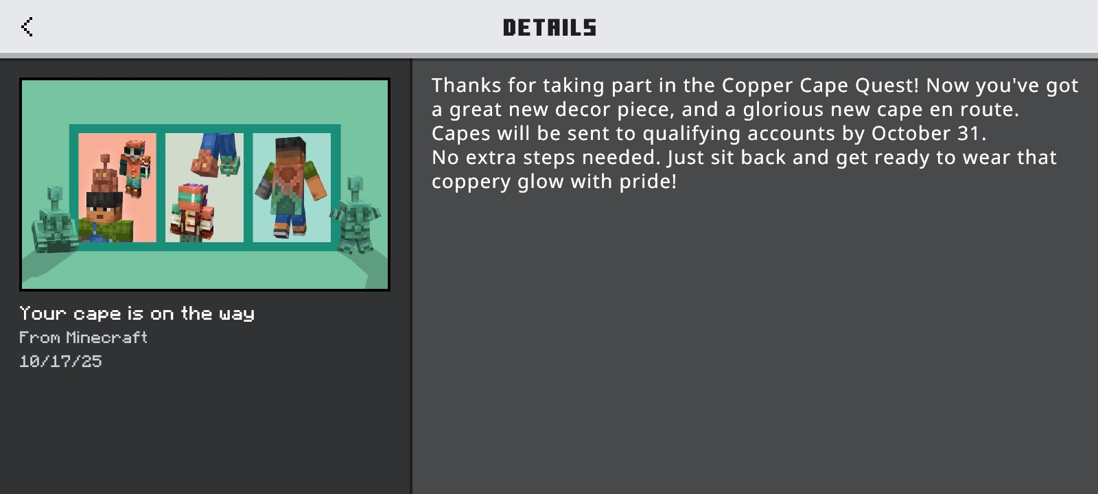 I completed the challenge to obtain the copper cape and received a message in-game saying that I would get the cape by October 31st. However, I never got it.