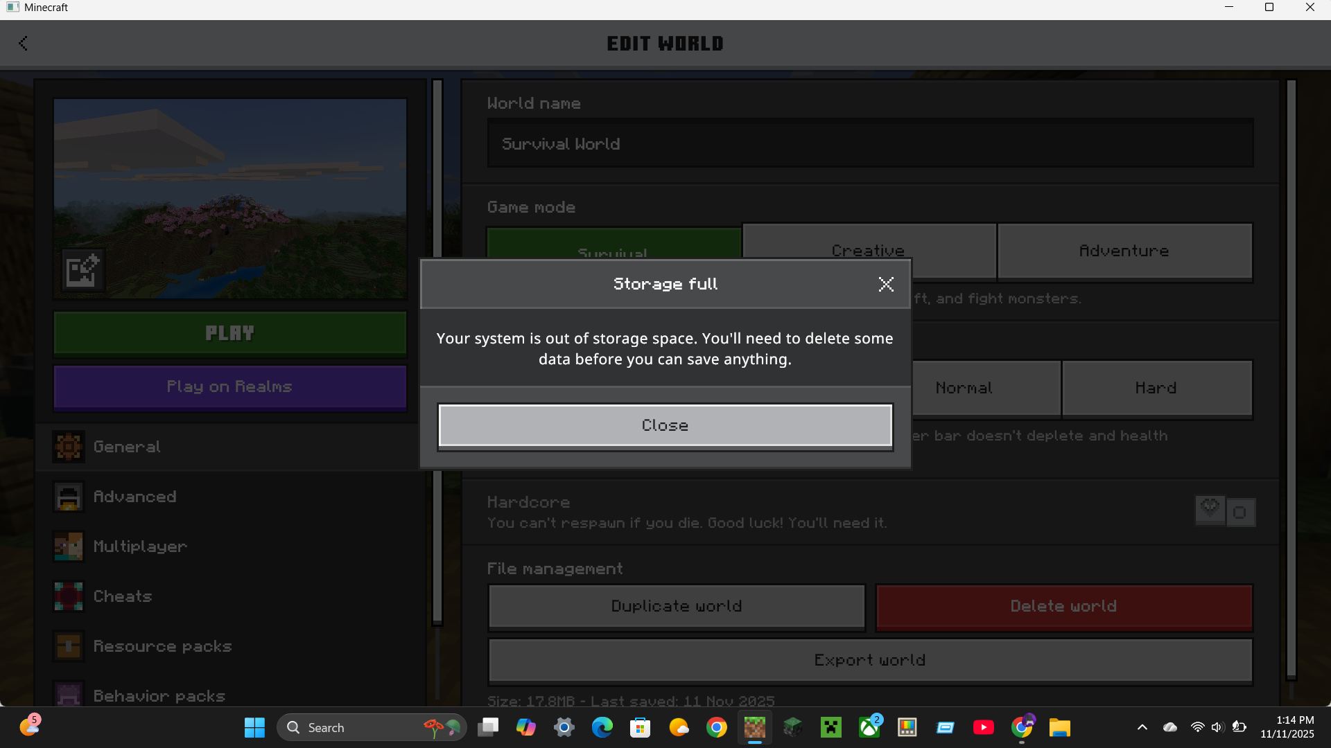 I try to attempt to export my Minecraft world called, “Survival World”. It first says that there is an issue and to wait. Ok, I thought, I'll just copy the world. But it claims that I have little storage even though I have 700GB of storage, and the world is 17.8 MB. I deleted most of the storage, but still won’t fix the solution. And its not corrupted either.