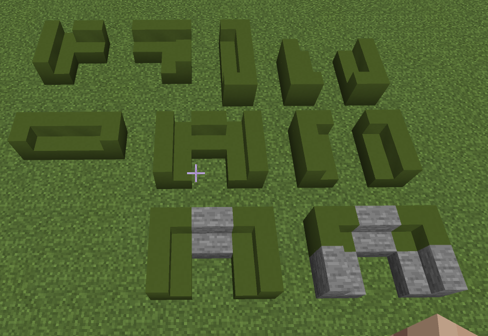 Using “minecraft:corner_and_cardinal_direction” and the “minecraft:cornerable_stairs” block tag, placed a number of permutations utilizing both custom and vanilla stairs.