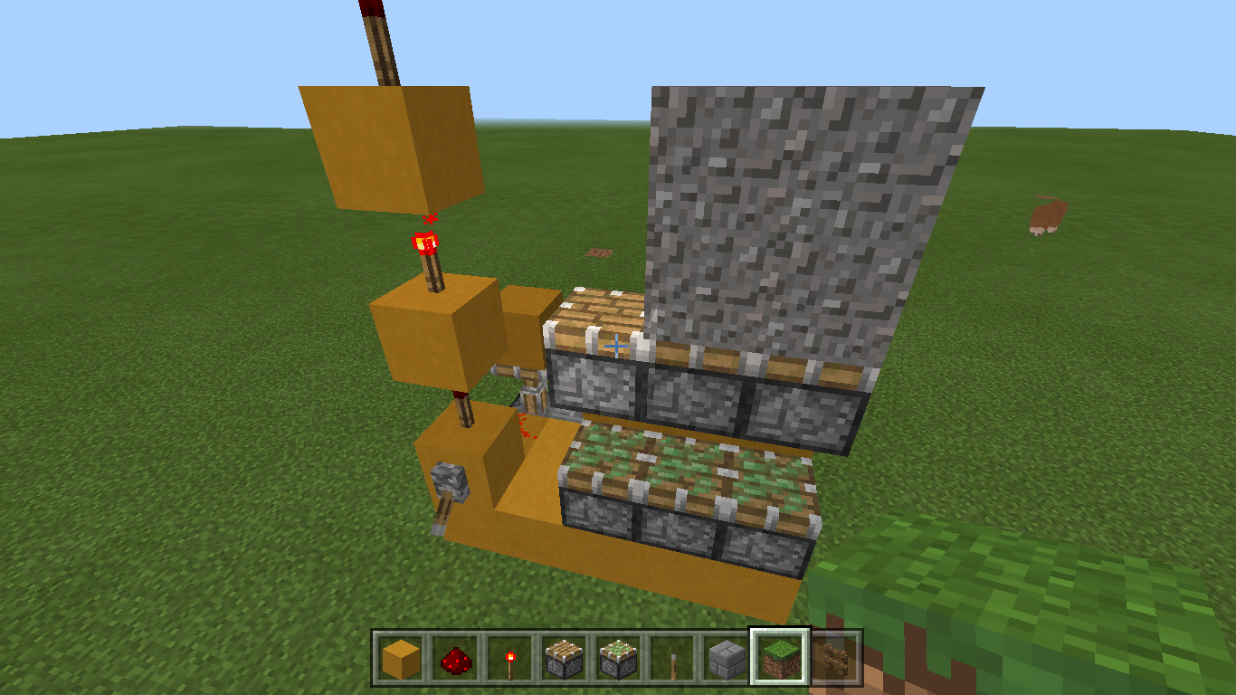*EDIT : The "redstone charge problem" (point 2) is referred to when pulling the lever back up, the upper pistons are supposed to push back down the blocks but it doesn't unless you flip the lever repeatedly but what this causes is for the gravel blocks to break