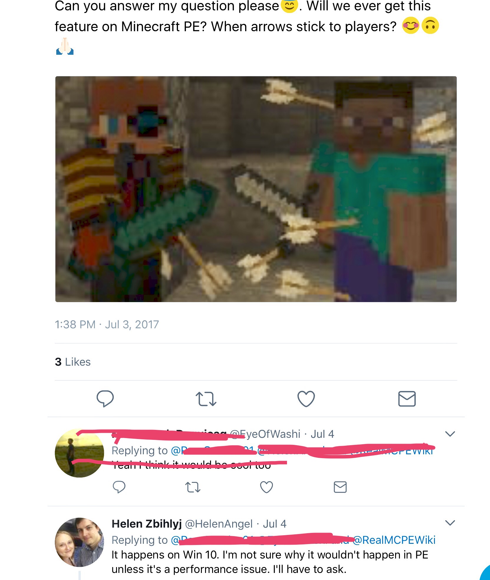 When arrow gets hit by player in Minecraft: Pocket Edition the arrows don't stick on the player.