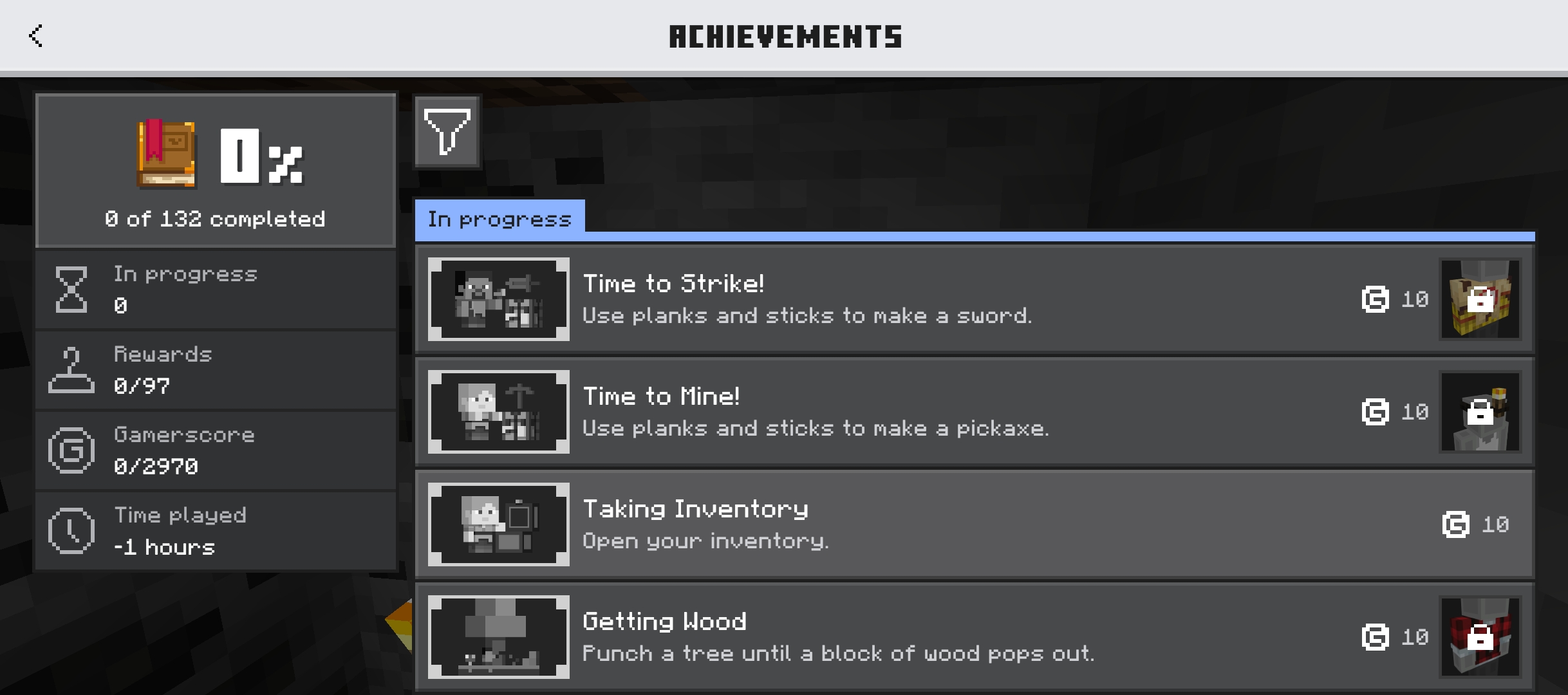 Ive been playing with the new account for like an hours because in my achievement book (achievement book in worlds, i use new world without anything that will turned off the achievement) it says in time played -1 hours, but after 1 hours 44 minutes, i relog and then load the world and check in again, its still -1 hours. This issue have been occurred in my previous account too, and im still cant get my achievement till this days