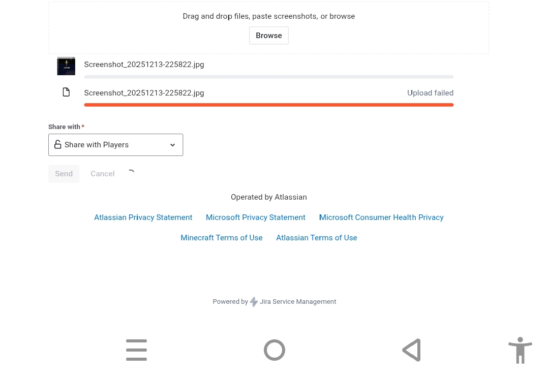 You need to fix this dumb bug report site, i literally can't send because im stuck in the stupid loading because one image failed and what's even worse is you can't even remove the failed image and you are forced to create another one. What e BS
