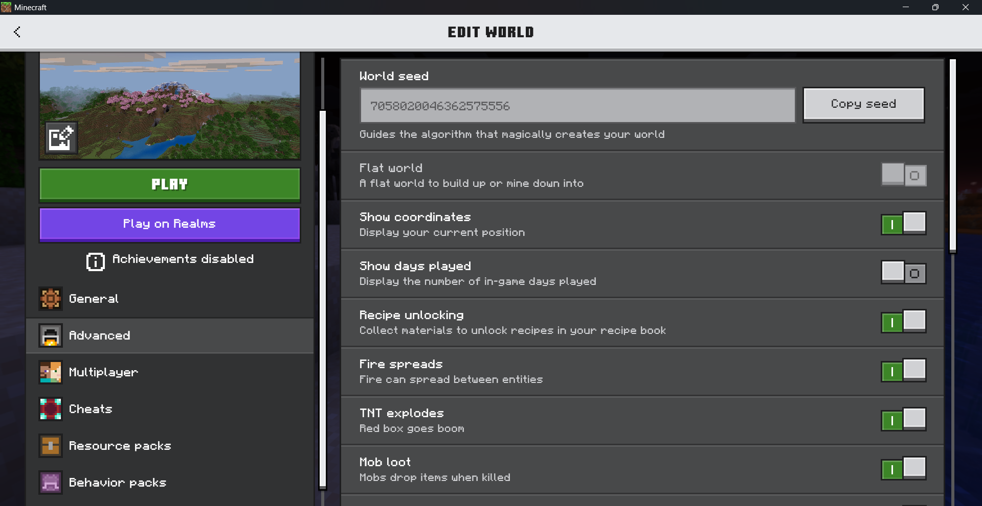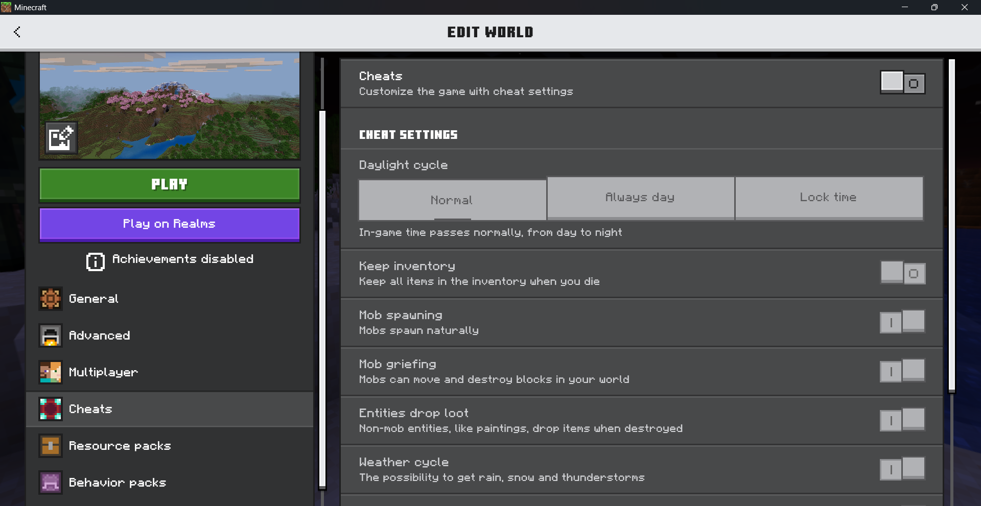 I go to play on my Minecraft world, usual stuff. I get a new goat horn and log out. Then I see that achievements are disabled.