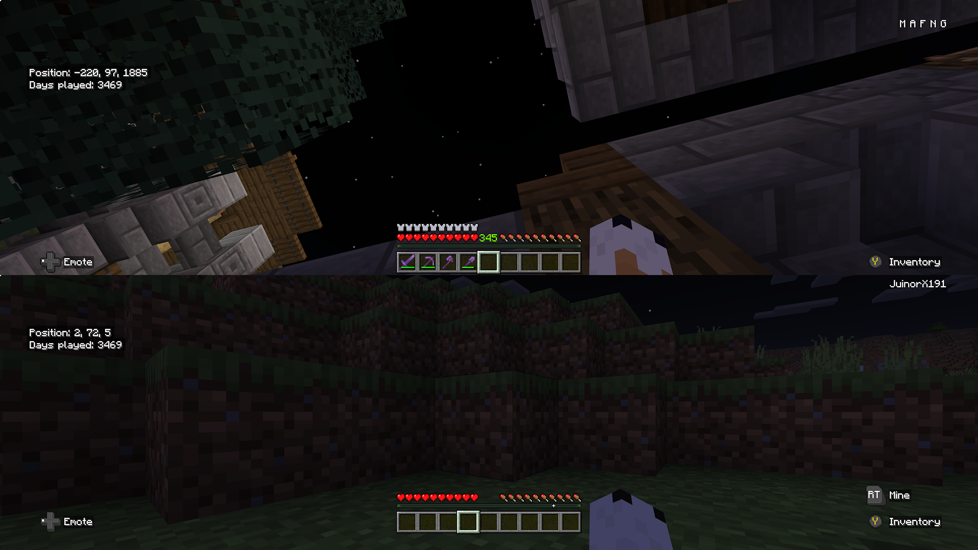 In my three player survival world when a another player joins in the it goes splitscreen and the players account got wiped in the newest update and this never happened before.If another player joined then there account would also be wiped and they would spawn as the same player that the other account got wiped on.